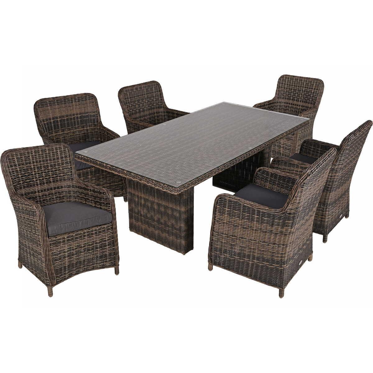 Entdecken Sie die Tischgruppe Bordeaux, die elegante und funktionale Ergänzung für Ihren Aussenbereich. Mit seinem pulverbeschichteten Stahlrahmen, dem attraktiven nelkenbraunen Kunststoffgeflecht und der klaren Glasplatte bietet der Bordeaux Tisch eine moderne Ästhetik, die sowohl strapazierfähig als auch leicht zu reinigen ist. Die sechs mitgelieferten Bordeaux Stühle, ebenfalls aus pulverbeschichtetem Stahl mit kunstvoll gestaltetem Geflecht, sind mit Auflagen für zusätzlichen Komfort ausgestattet. Ideal für gesellige Zusammenkünfte, bietet diese Tischgruppe eine einladende Atmosphäre für Ihre Terrasse, Ihren Garten oder Balkon. Geniessen Sie stilvolle Momente im Freien mit dieser qualitativ hochwertigen Möbelgruppe.