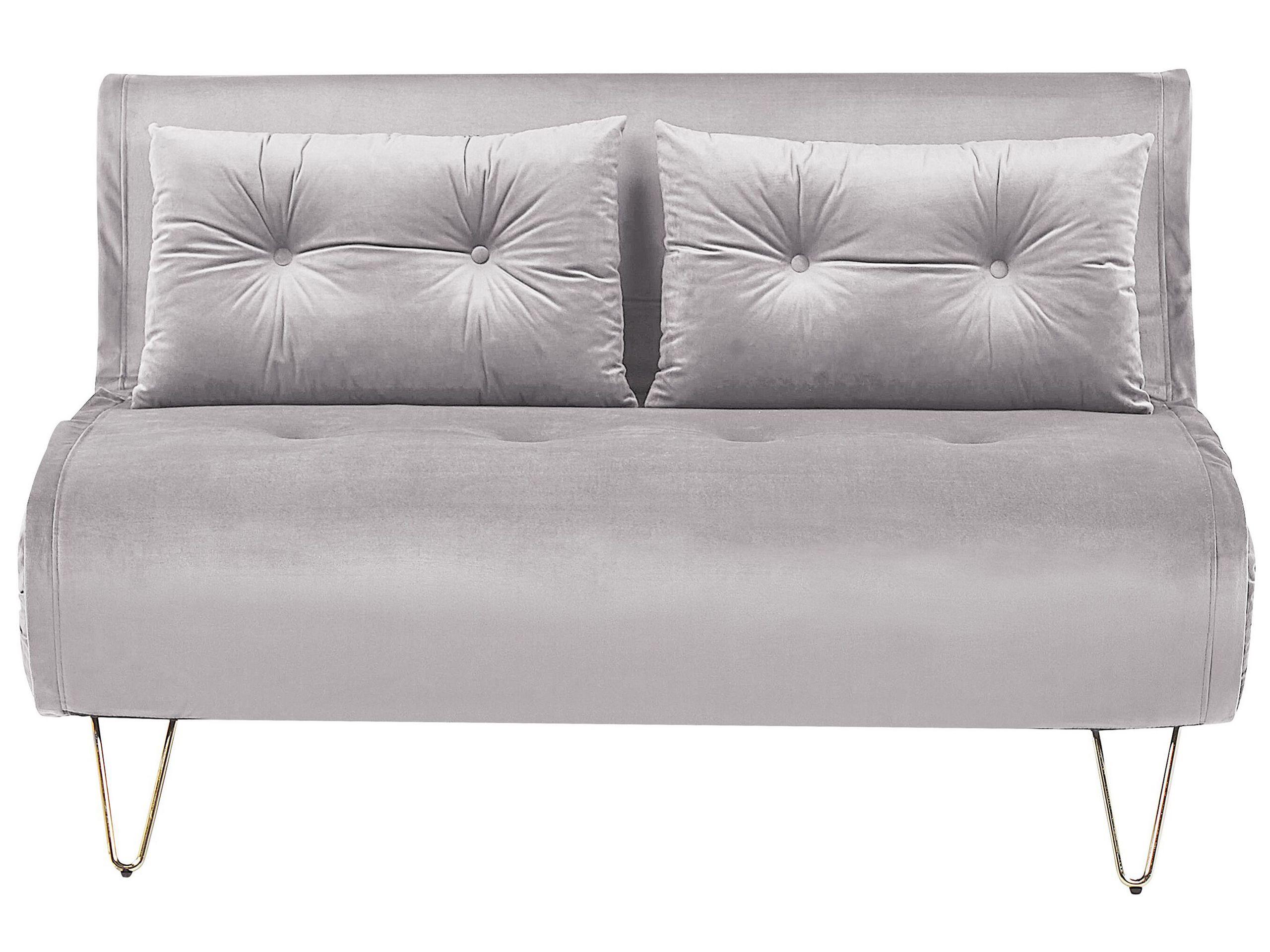 Eindrucksvolle Samt Couch für 2 Personen mit Bettfunktion und Zierkissen. Ein kompakter Sitz- und Liegeplatz im einem. Beim Ausklappen genügt es die verstecken Metallbeine aus dem Bezug herauszunehmen, um sehr schnell einen gemütlichen Liegeplatz beim Fernseher oder ein Bett für Übernachtungsgäste zu gewinnen. Die breite Sitzfläche ist besonders dick, so sitzt man auf dem Modell regelrecht königlich. Zudem bezaubert das Polstersofa mit seiner formschönen Konstruktion, die mit gold bemalten Harpin Beinen und einem geschmeidigen Samtbezug veredelt wurde. So sorgt der 2-Sitzer für eine gelassene, dennoch stilbewusste Optik im Schlaf- oder Wohnbereich.