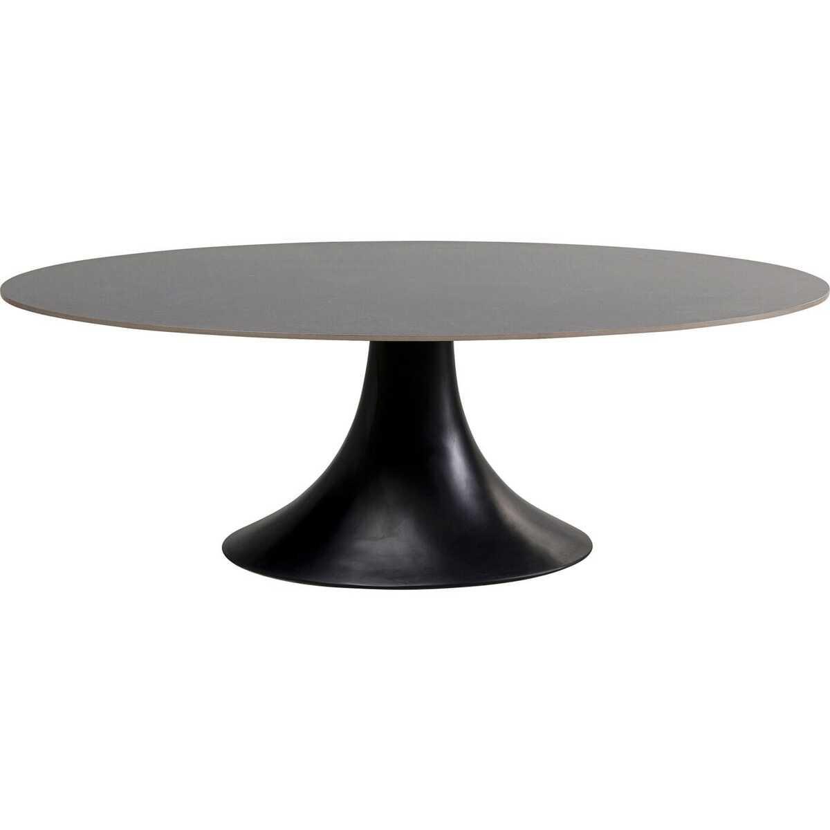 Esszimmertisch mit futuristischen Vibes: mit diesem skulpturalen, ovalen Tisch ganz in Schwarz holen Sie sich definitiv ein modernes Statement-Möbel in Ihr Zuhause! Die hochwertige Tischplatte aus dunkler Keramik erinnert durch ihre Maserung und Optik an Naturstein. Den Look perfekt macht der extravagante Fuss aus pulverbeschichtetem Metall in Tulpenform. Der runde Fuss wird nach unten hin immer breiter und setzt die runde Linienführung des Esszimmertisches harmonisch konsequent fort. Mit der Farbe Schwarz fügen Sie zudem einen spannenden Kontrast in Ihren Wohnstil ein. Aufgrund seiner Masse bietet der Tisch ausreichend Platz für Ihren Besuch, der von diesem Möbelstück garantiert hin und weg sein wird!Schwarzer, ovaler Tisch 220x120cmErstklassige Materialien: Tischplatte aus Keramik und schwarzer Tulpenfuss aus MetallGrosser Tisch zum Einsatz im Wohnzimmer, Esszimmer oder als Besprechungstisch im BüroModernes Design, das klassisch und auffallend zugleich istBietet Platz für ca. 8 PersonenProduktinformation Tischplatte: Keramik Dolomit, Fuss: Aluminium pulverbeschichtet (und klar lackiert), 80 kg max. Belastbarkeit