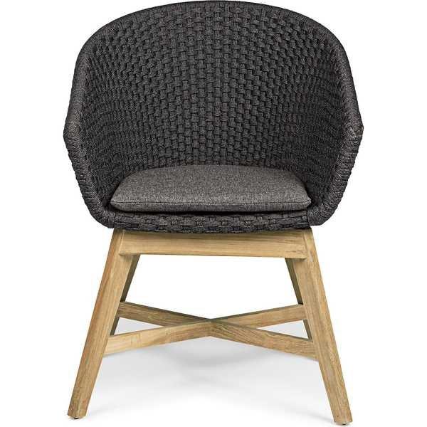 Garten Armlehnstuhl Coachella mit Kissen anthrazit. Sitz mit pulverbeschichtetem Aluminiumrahmen (Polyester). Olefin-Seilgeflecht (100% Polypropylen). Sitzkissen mit abnehmbarem Bezug aus sonnenbeständigem Olefin-Gewebe (100% Polypropylen). Beine aus Teakholz SVLK (zertifiziertes Holz aus nachhaltiger Forstwirtschaft). Schrauben aus verzinktem Stahl. Beine zur Montage.