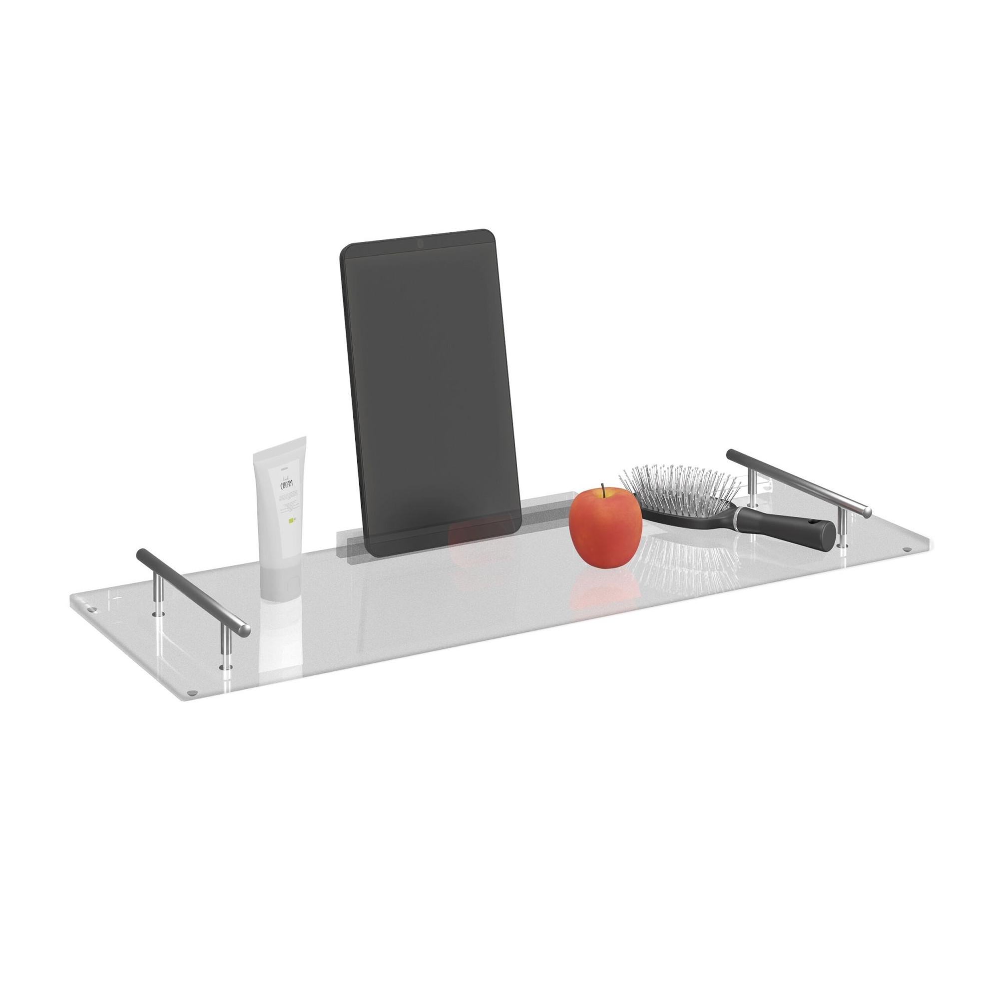 Gönnen Sie sich mit diesem modernen Badewannenregal entspannende Momente in der Badewanne. Das transparente Acrylregal lässt sich mithilfe der silberfarbenen Griffe einfach am Badewannenrand befestigen. Dank der Standfüße steht das Regal stabil und sicher. Es bietet Platz für ein Buch oder Tablet sowie für ein Weinglas. Die glatte Oberfläche des Acrylregals ist schmutzabweisend und lässt sich bei Bedarf einfach mit einem feuchten Tuch reinigen.