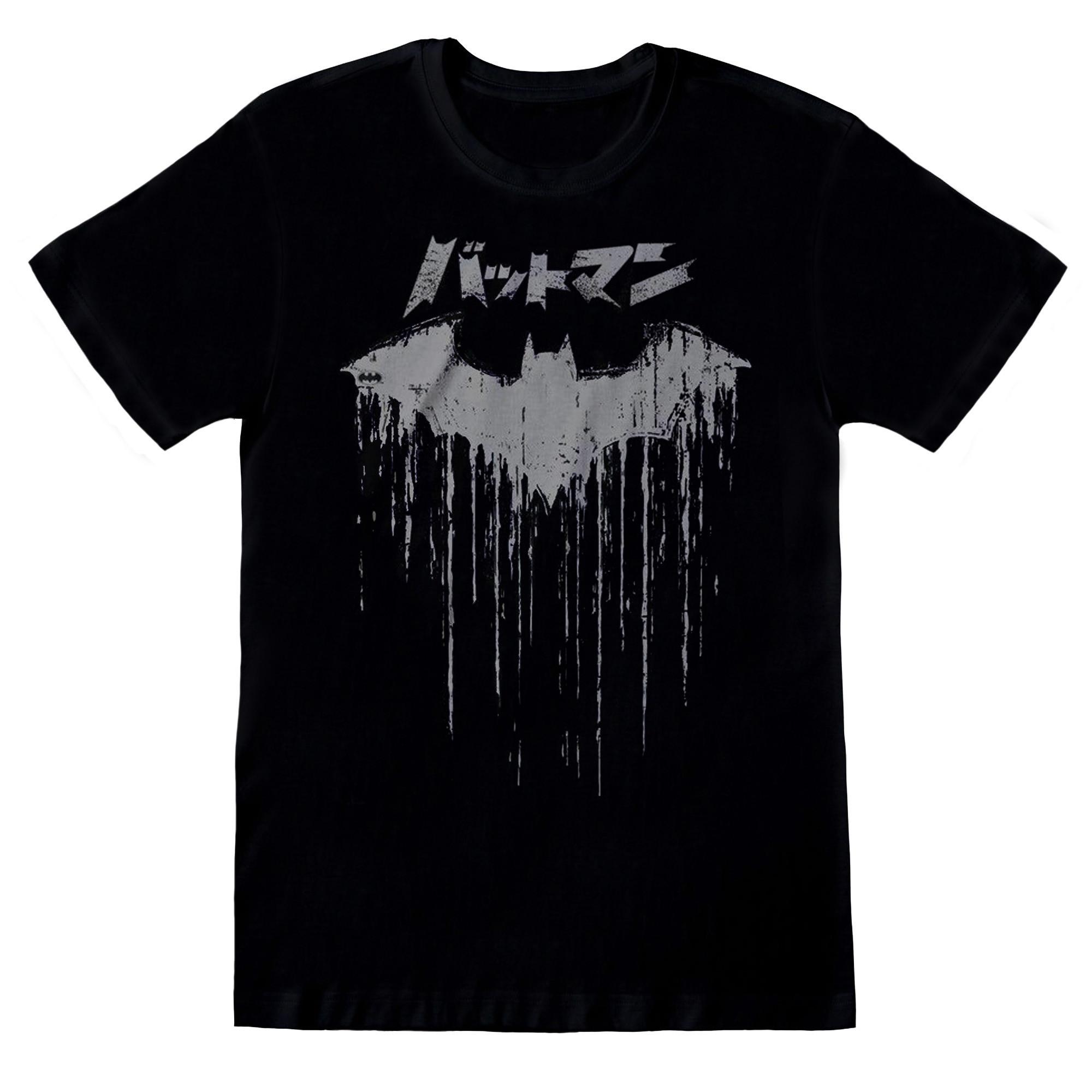 Dieses T-Shirt zeigt einen auffälligen Grafikdruck des ikonischen Batman-Logos mit einem Used-Look und tropfendem Effekt. Über dem Logo ist das Wort "Batman" in japanischen Schriftzeichen geschrieben, was diesem klassischen Superhelden-Kleidungsstück eine einzigartige kulturelle Note verleiht. Das Shirt ist mit einem bequemen Rundhalsausschnitt und kurzen Ärmeln ausgestattet und eignet sich somit für den Alltag.