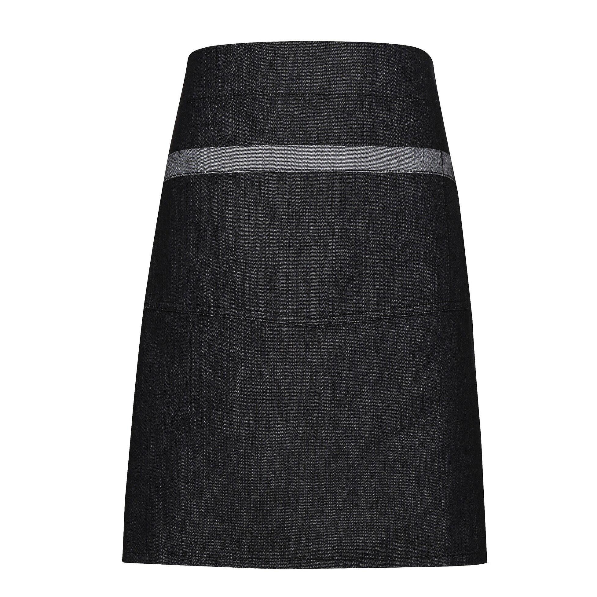 Mittlere Länge mit zwei Metall Ösen zur Befestigung der Schürze. Die große Tasche ist 36cm breit mit Stift Tasche. Kontrastsaum an Tasche und Riegeln gibt einen zweifarbigen Denim-Effekt. 50cm Länge x 70 Breite. Material : 70% Baumwolle, 30% Polyester.