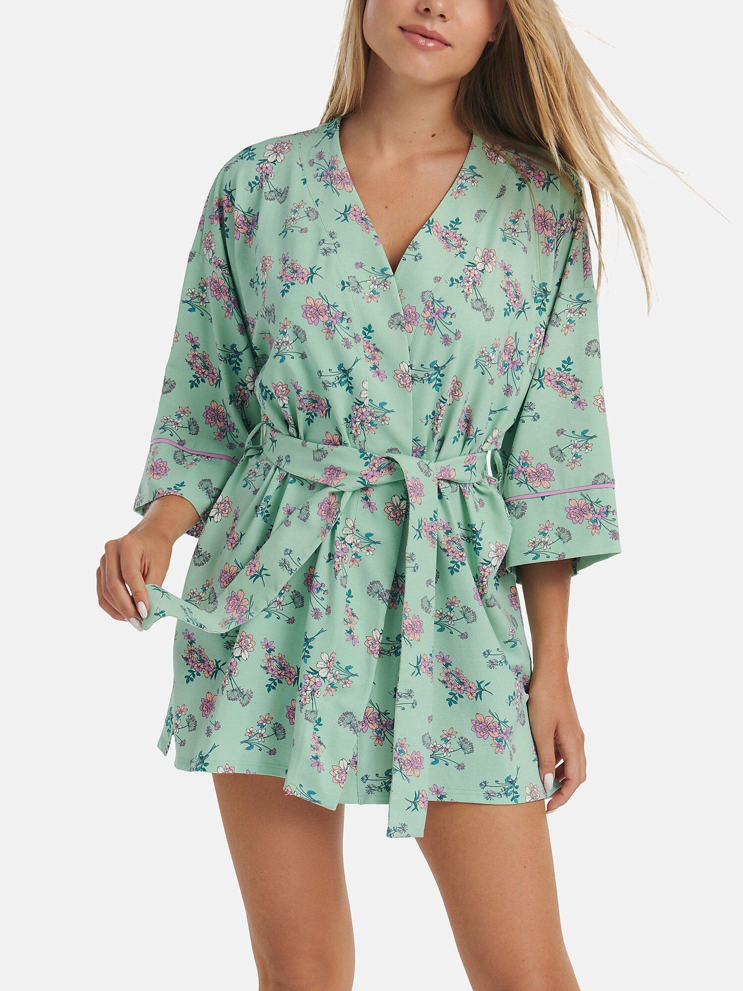 Dieses Negligé aus der Posh Collection bietet einen lockeren Schnitt mit Gürtel. Die 3/4-Ärmel haben ein schmales Zierband und ein floraler Druck bedeckt die gesamte Fläche. Mit einer Länge von ca. 80 cm begeistert diese Sommernachtwäsche mit ihrer erfrischenden Farbpalette und dem wunderschönen Blumenmuster. Es ist leicht und bequem, und der Baumwollstrick passt sich gut an den Körper an.