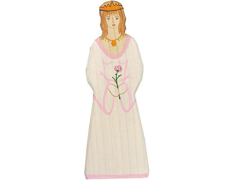 Die Holzfigur Prinzessin ist aus massivem Ahorn- und Buchenholz handgearbeitet und mit sorgfältigen Details bemalt. Sie misst 6 x 2,4 x 16 cm und besticht durch ihre sanfte Abrundung. Die Farben sind auf Wasserbasis und somit kinderfreundlich.