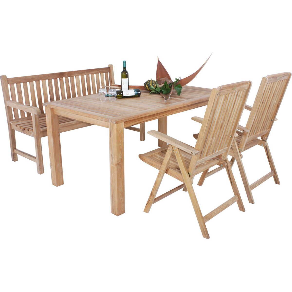 Aus hochwertigem Teakholz für Langlebigkeit und Schönheit Tisch mit Ausziehfunktion für zusätzlichen Platz Vier Hochlehner mit 5-fach verstellbarer Rückenlehne für optimalen Komfort Perfekt aufeinander abgestimmtes Set verleiht Eleganz Robuste Verarbeitung für langanhaltende Freude Ideal für gemütliche Mahlzeiten und gesellige Stunden im Freien Tisch: Maximale Belastbarkeit 39 kg, Stühle: Maximale Belastbarkeit 120 kg