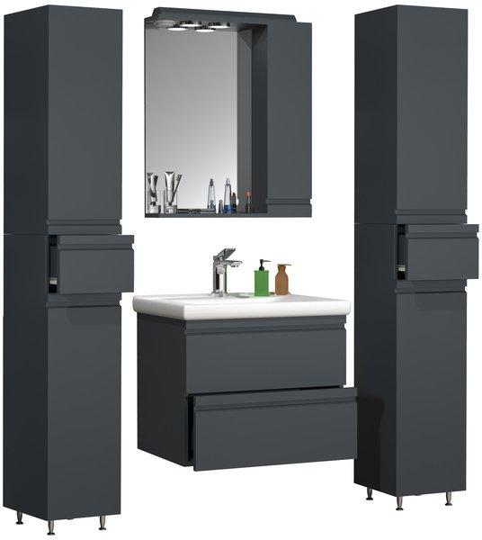 VCM, 5-tlg. Waschplatz Waschtisch 60 cm Badmöbel Set Waschbecken grifflose Schublade Spiegelschrank Hochschrank Silora L