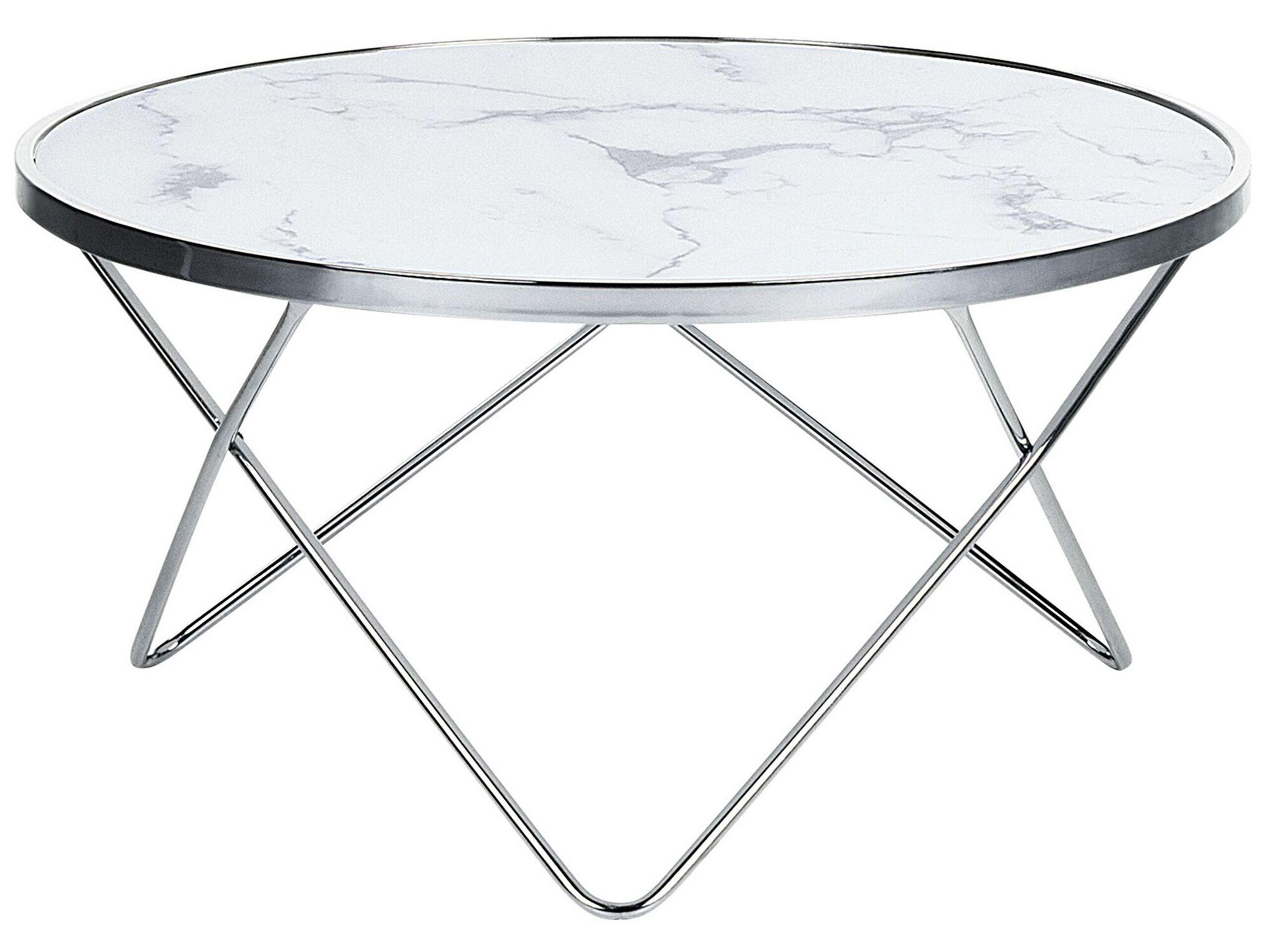 Runder Couchtisch mit weisser Marmor-Optik. Dank der runden Form und der eleganten, V-förmigen Füsse in glänzendem Design wirkt dieser Tisch sehr modern und passt sich perfekt Ihrem Einrichtungsstil an. Die schicke Tischplatte in Marmor-Optik bietet genug Abstellplatz und die stabile Konstruktion aus silberfarbenem Metall verspricht Stabilität. Er kann sowohl als kleiner Couchtisch, für Kaffeekränzchen wie auch als universeller Beistelltisch genutzt werden.