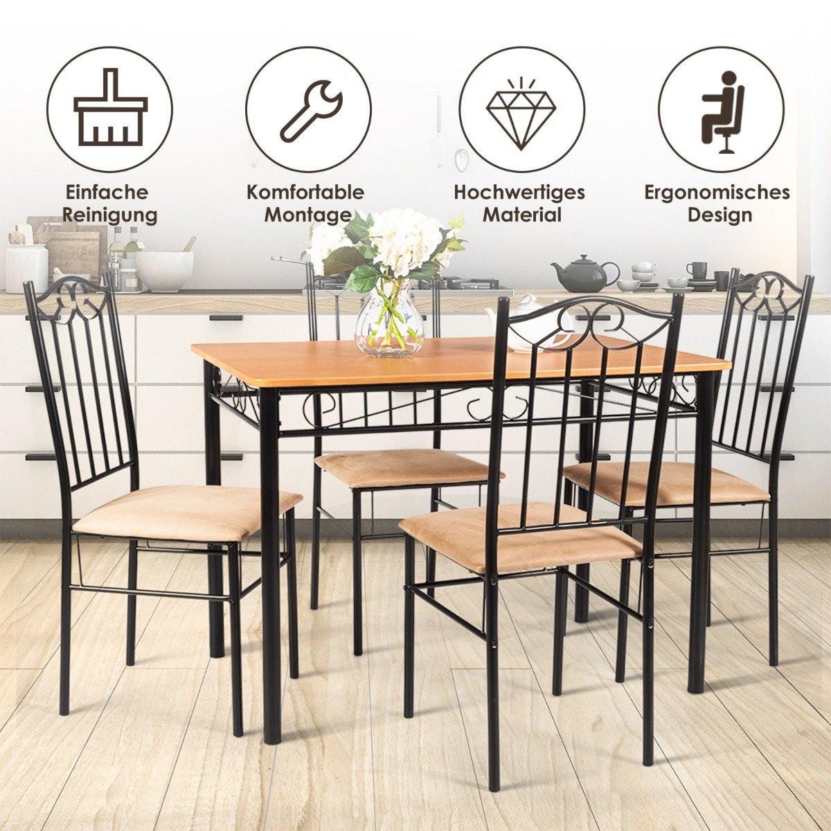 Sind Sie auf der Suche nach einem hochwertigen Esszimmerset, das sich nahtlos in Ihre Inneneinrichtung einfügt? Dann sind Sie bei unserem exquisiten Esszimmer-Set genau richtig! Dieses Esszimmerset besteht aus vier Stühlen und einem Tisch und ist so konzipiert, dass es die meisten Ihrer täglichen Bedürfnisse erfüllt. Die gesamte Tisch- und Stuhlkonstruktion ist mit Präzision gefertigt und aus Metallrohren gefertigt, die für ihre außergewöhnliche Robustheit und Haltbarkeit bekannt sind. Dank des Premium-Gestells ist der Tisch bis zu 60 kg belastbar, sodass Sie zahlreiche Gegenstände frei platzieren können. Jeder Stuhl trägt bis zu 80 kg und sorgt so für Sicherheit und Komfort beim Sitzen.