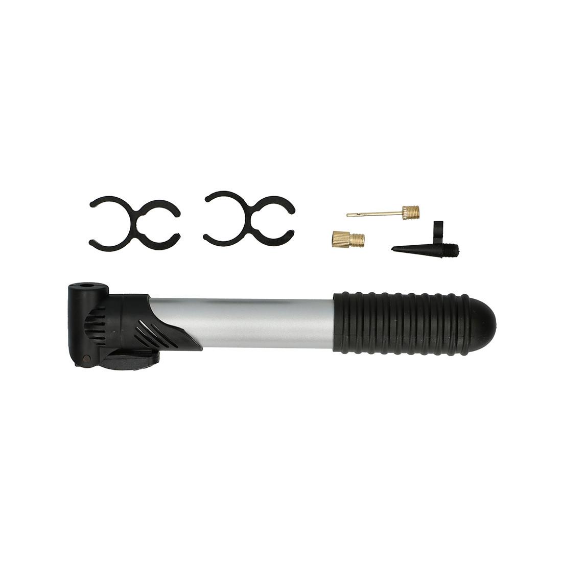 Produktinformation, , Lässt sich praktisch am Velorahmen montieren, Mit drei verschiedenen Adapter, Für alle gängigen Velos geeignet, Kompakte Grösse: (20-46 cm), Einfach zu verwenden, Ausstattung:, , 1 x Mini-Fahrradpumpe, 1 x Adapter für Autoventil, 1 x Dunlop-Ventiladapter, 1 x französischer Ventiladapter, 2 x Halterungen