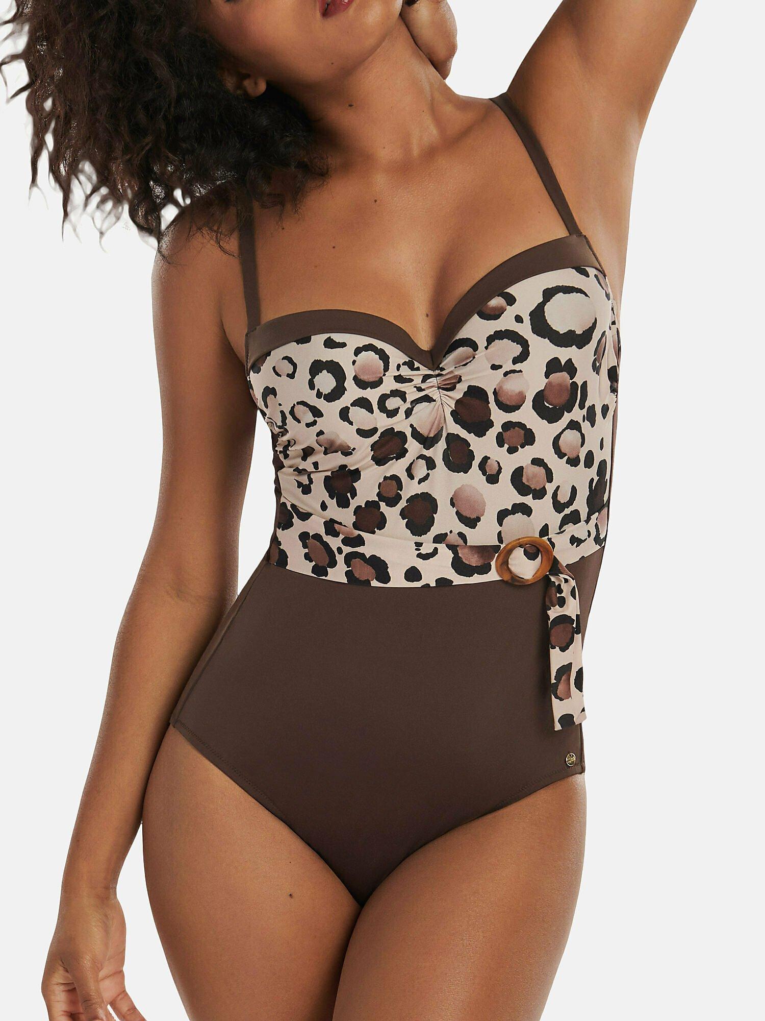 Veracruz ist eine elegante und feminine Linie mit modernem Animalprint. Die sexy Silhouette mit malerischem Tachismus ist vom Leoparden inspiriert, einem starken Tier, das einen Eindruck von Selbstvertrauen, Entschlossenheit und Mut hinterlässt. Der starke Eindruck des Leopardenmusters wird durch das einfarbige Material gemildert, das so eingesetzt wird, dass es die weibliche Silhouette optisch verschlankt und dem Modell einen leicht modellierenden Effekt verleiht. Einige Modelle sind mit einer dekorativen Schließe versehen, die den Eindruck erweckt, aus natürlichem Holz gefertigt zu sein. Erhältlich in Naturbraun oder elegantem Blau, sind diese beiden schicken und weniger gewagten Farbvarianten perfekt, um die Weiblichkeit auszudrücken.