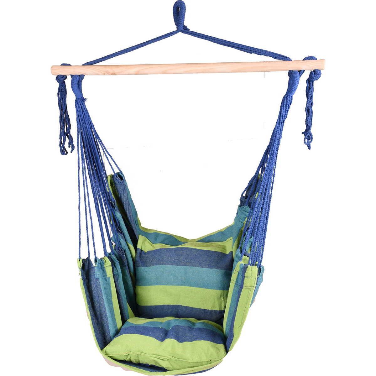 Einladendes und komfortables Design ideal zum Entspannen Baumwoll-Polyester-Mix in harmonischen Grün- und Blautönen Stabile Hartholzstange für sicheres Aufhängen Zwei weiche Kissen für zusätzlichen Sitzkomfort Optisch ansprechend für eine moderne Outdoor-Atmosphäre Maximale Belastbarkeit von 120 kg Ohne Reissverschluss für eine nahtlose Ästhetik Geschliffene Holzoberfläche für einen natürlichen Look