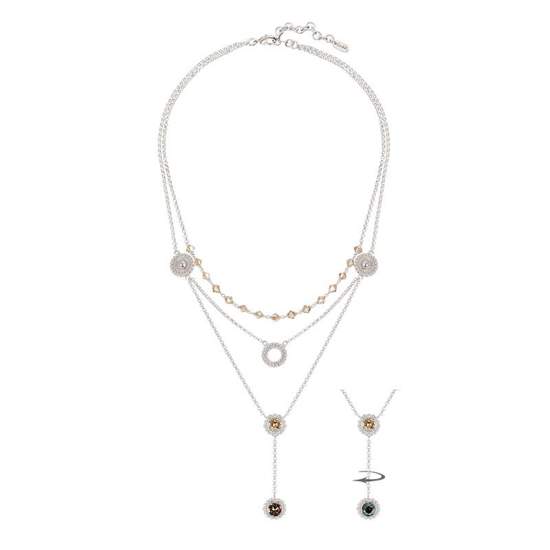Entdecken Sie unsere bezaubernde dreilagige Halskette, die Ihrem Look eine elegante Note verleiht. Mit kunstvoll verzierten Elementen, die teilweise mit funkelnden Kristallsteinen besetzt, ist dieses Schmuckstück ein wahrer Blickfang.