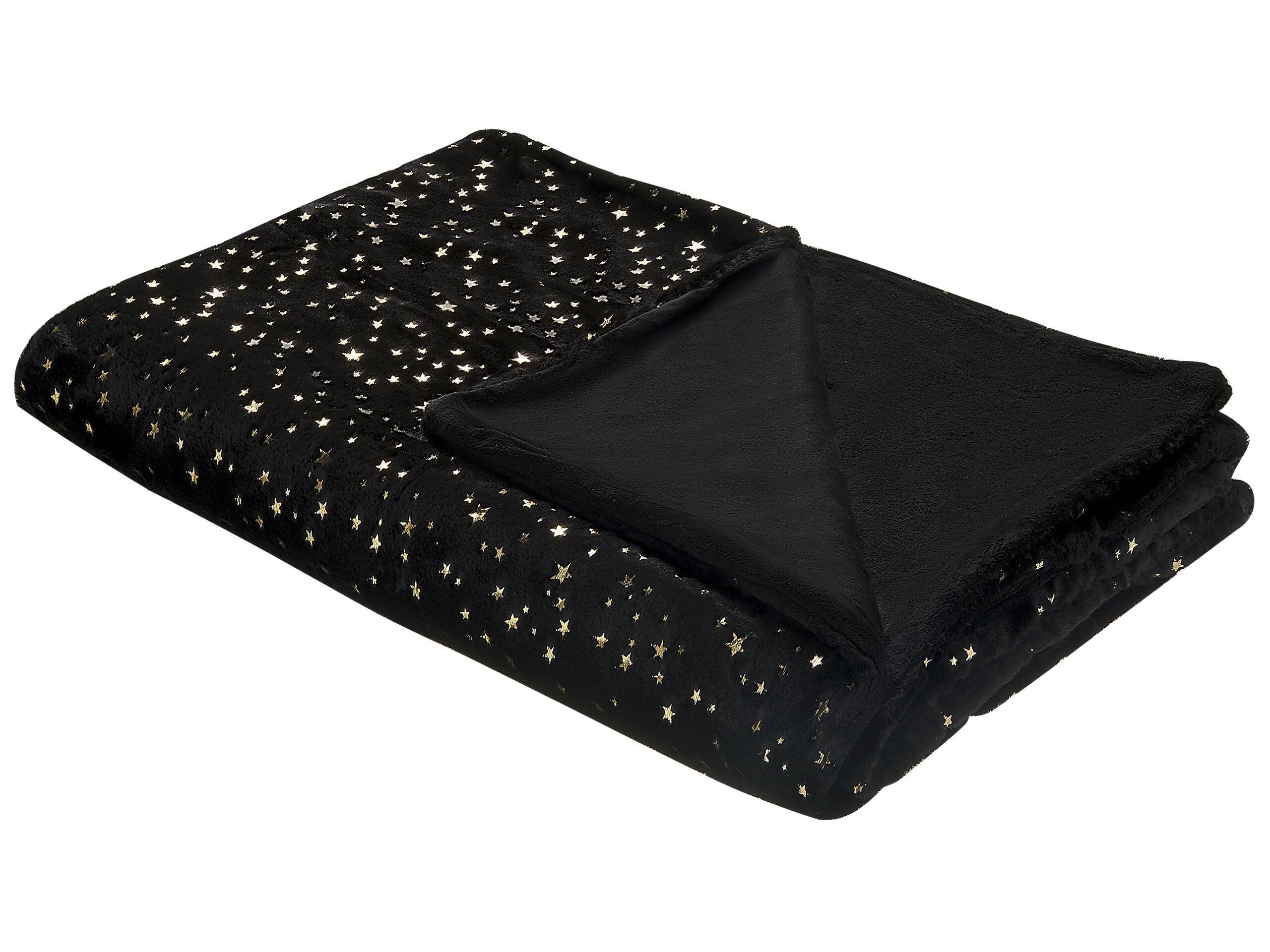 Die Kuscheldecke ALAZEYA bietet eine weiche und einladende Textur, perfekt um jedem Wohnraum Komfort zu verleihen. Ihr modernes Design zeigt einen schwarzen Hintergrund, der mit schimmernden goldenen Sternen verziert ist und eine stilvolle und gemütliche Atmosphäre schafft.
