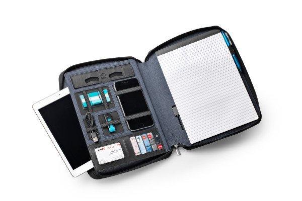 Konferenzmappe mit Powerbank Die praktischen Konferenzmappe "Smart Organizer" in den Grössen A4 und A5 eignen sich ideal für das mobile Arbeiten. Dank der integrierten Powerbank (5000 mAh) können das Smartphone oder Tablet überall aufgeladen werden. Die Konferenzmappen verfügen über diverse Fächer für Tablet, Smartphone, Unterlagen und Visitenkarten. Zudem können USB-Sticks, Ladekabel und vieles mehr, sauber und übersichtlich verstaut werden. Aus strapazierfähigem, wasserabweisendem Textilmaterial gefertigt, mit umlaufendem Reissverschluss. Inklusive Schreibblock mit 20 Blättern Diverse Fächer für die Ablage von Kleinmaterial, grosses Fach für Smartphone (bis 6?), Seitliches Innenfach für das Verstauen von Unterlagen oder Tablet (Konferenzmappe A5 bis 10", Konferenzmappe A4 bis 13") Inklusive Schreibblock (DIN A4) mit 20 Blättern und aufklappbare Halterung für Smartphone oder Tablet - ideal für Präsentationen Aus strapazierfähigem, wasserabweisendem Textilmaterial und umlaufendem Reissverschluss Auf der Vorderseite zusätzliche Einschubtasche für Unterlagen oder Smartphone Batterietyp: Lithium Polymer 3.7 V, Batteriekapazität Powerbank: 5000 mAh (kann ein Smartphone / Tablet 1 - 3 mal aufladen, abhängig von deren Batteriekapazität) Eingangs-/Ausgangsleistung: Input: 5 V ? 1 A / Output: 5 V ? 2.1 A