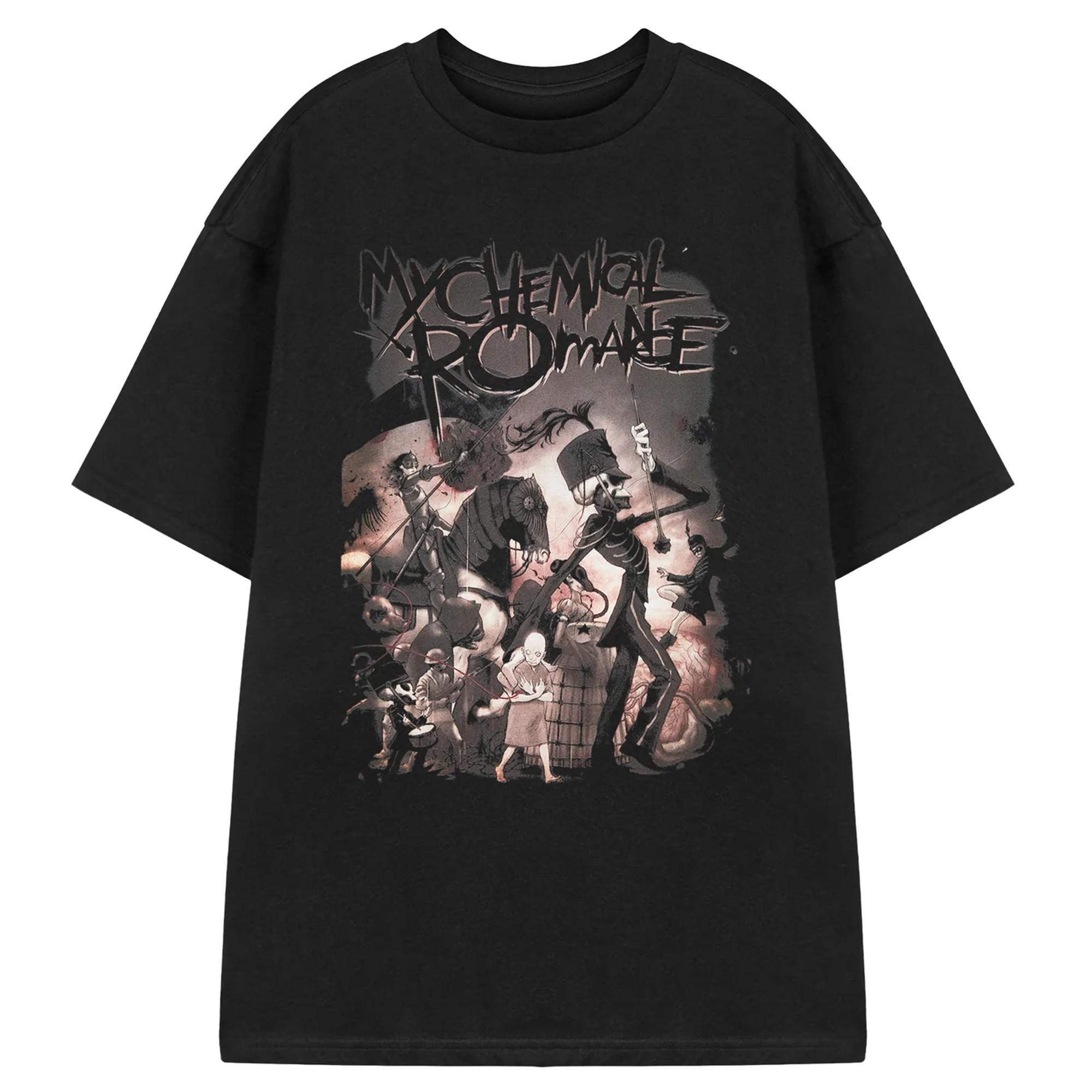 Dieses kurzärmlige T-Shirt zeigt einen auffälligen Grafikdruck, der von "The Black Parade" inspiriert ist. Das Design fängt die Essenz des ikonischen Albums ein und macht es zu einem unverwechselbaren Stück für Fans.