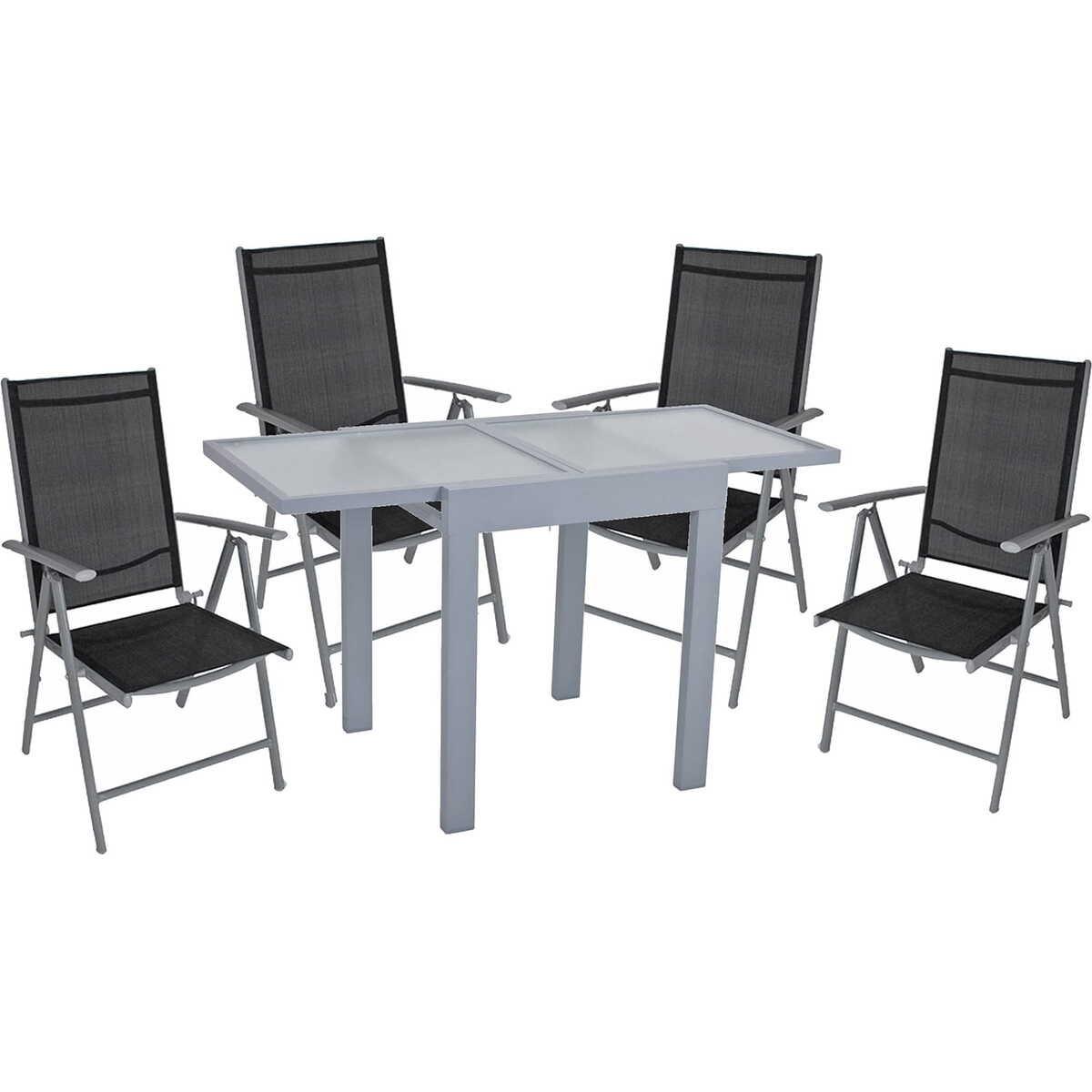 Stilvolles und praktisches 5-teiliges Set Ausziehbarer Tisch für flexible Grössenanpassung Vier Hochlehner-Klappstühle für optimalen Komfort Hochwertige Aluminium- und Stahlkonstruktion Modernes Wellenglas-Design für einfache Reinigung Maximale Tischbelastbarkeit von 40 kg Einheitlicher Grauton, der zu verschiedenen Dekoren passt