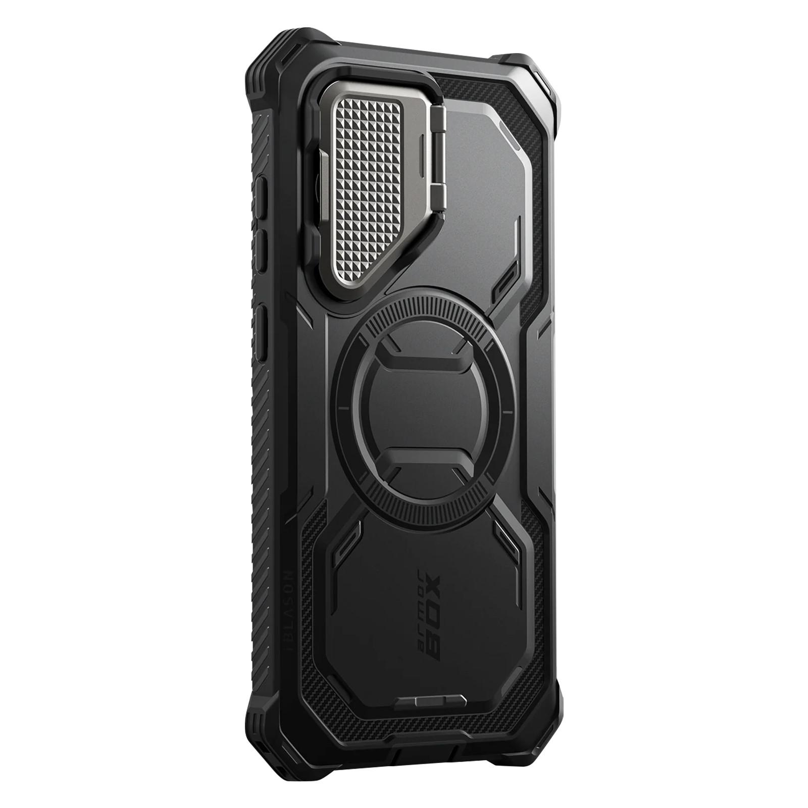 Vollschutz i-Blason für Samsung Galaxy S25, Armorbox-Serie. Robuste Schutzvorrichtung mit einer Rückseite aus Polycarbonat und einem Gel-Silikonrahmen. Zertifiziert nach MIL-STD 810G-516.6 mit 4 verstärkten Bumper-Ecken. Integrierter Displayschutz. Kameraabdeckung, die als multi-angled Stütze für Ihre Medieninhalte dient. Rutschfester Rand. Kompatibel mit MagSafe.