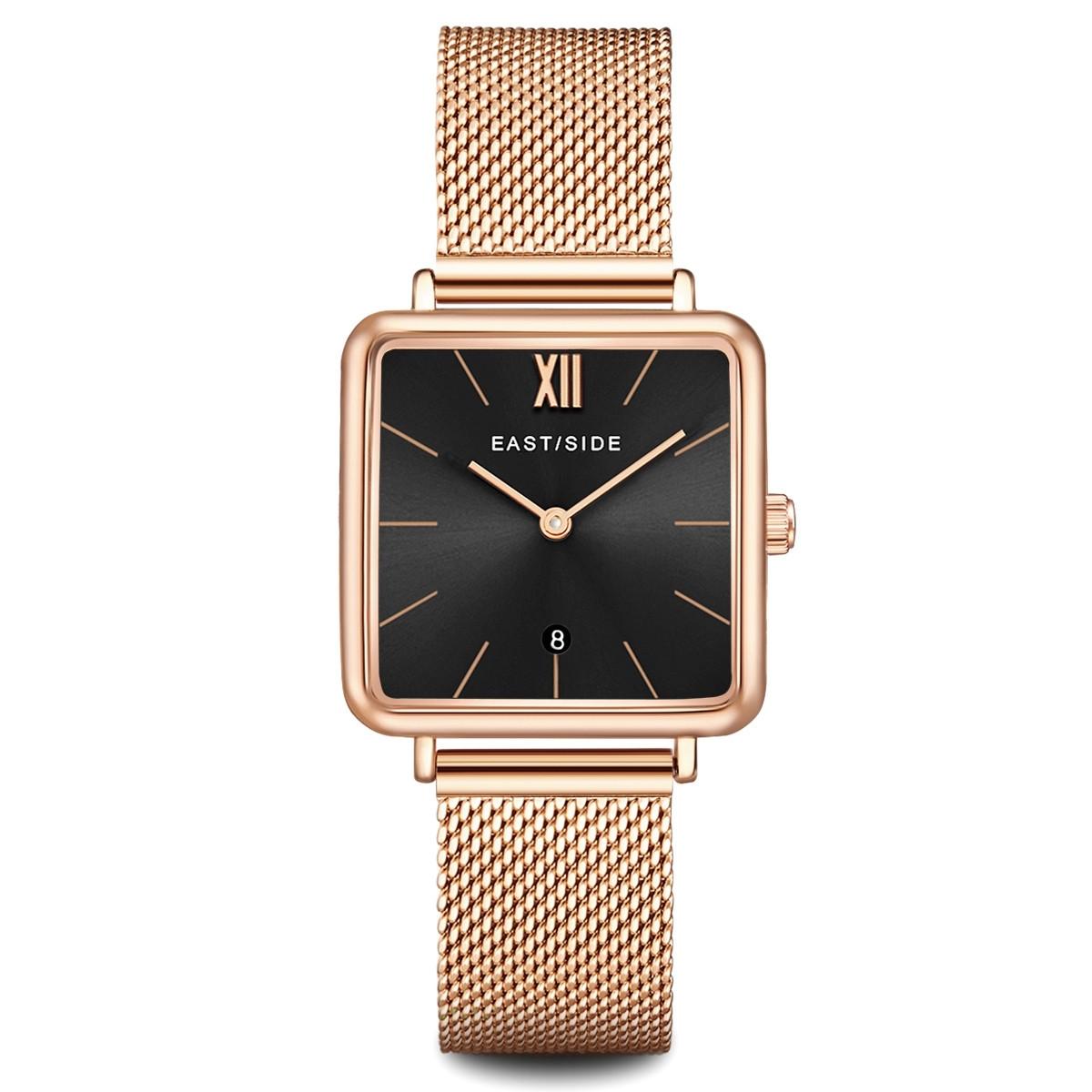 Wer gerne Ecken und Kanten zeigt, wird diese Damenuhr des Labels Eastside lieben! Edgy, urban und doch elegant-zeitlos greift sie das Lebensgefühl des New Yorker Stadtviertels Eastside auf. Eyecatcher ist das quadratische, IP-beschichtete Gehäuse, das dem Zeitmesser seinen markanten Charakter verleiht. Dezente Strichindices und Obélisque-Zeiger betonen das puristische Designkonzept, abgerundet durch ein stilvolles IP-vergoldetes Milanaise-Edelstahlarmband in Rosegold. Der sichere Schiebeverschluss sorgt für schnelle Anpassbarkeit und hohen Tragekomfort. Das High-End-Quarz-Uhrwerk bietet Präzision, ebenso wie die schlichte Datumsanzeige.