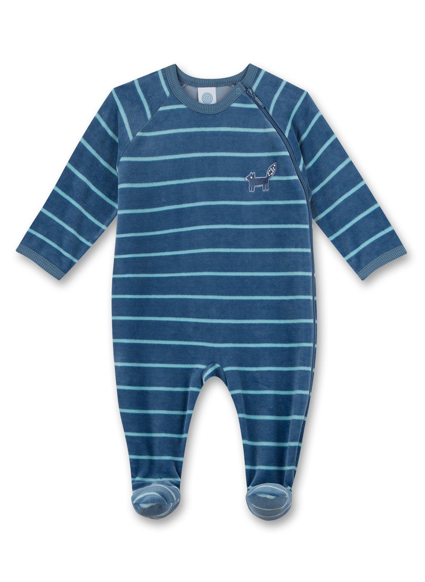 Blau geringelter Jungen-Overall zum Schlafen aus kuschelig weicher Nicki-Ware in angenehm softer Nicki-Qualität für einen gemütlichen Tragekomfort.