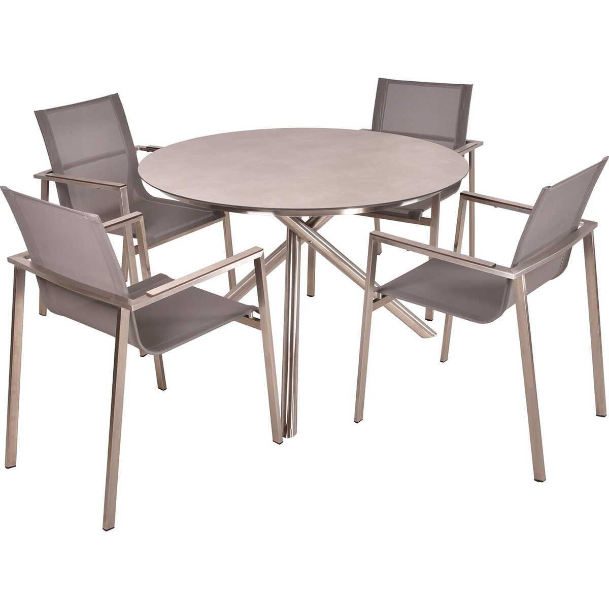 Die Tischgruppe Sienna, ein Inbegriff moderner Ästhetik und praktischer Effizienz, ist Ihre ultimative Lösung für ein unvergleichliches Outdoor-Esserlebnis. Mit einem Tisch aus hochwertigem Edelstahl und einer strapazierfähigen, grauen Kunststoff-HPL-Tischplatte, begleitet von vier stapelbaren Stühlen in Taupe-Grau, bietet dieses Set ein perfektes Gleichgewicht zwischen Design und Funktionalität, um Ihre Aussenbereiche auf ein neues Niveau der Stilvollen Eleganz zu heben.