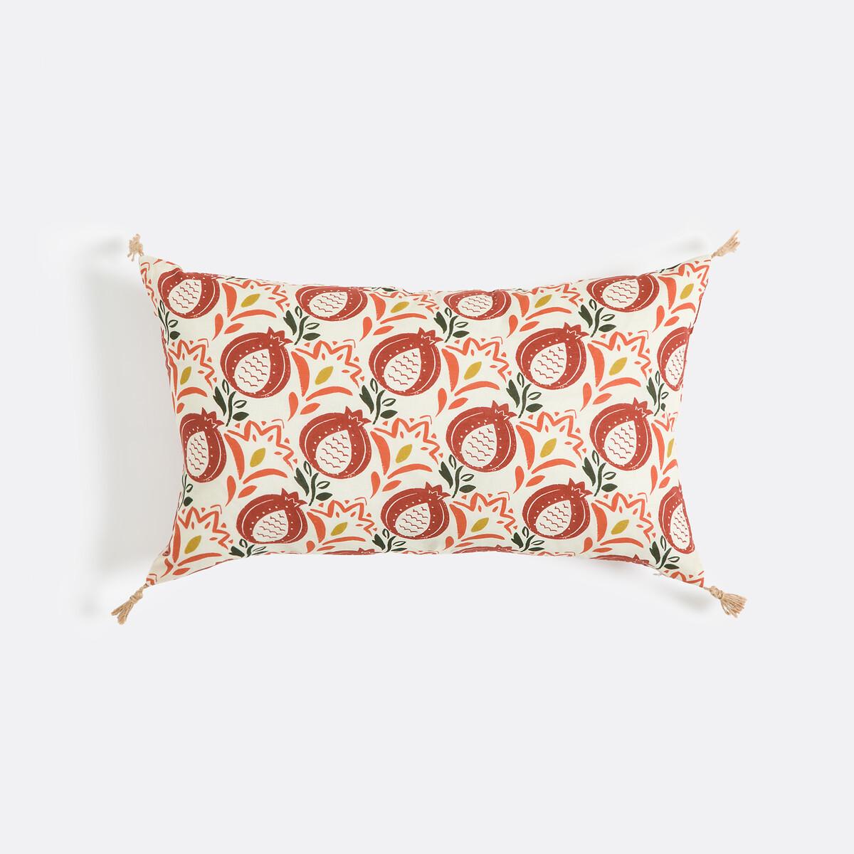 Dieser Kissenbezug präsentiert ein lebhaftes Granatapfelmuster auf ecrufarbenem Hintergrund und bringt einen Hauch des Mittelmeers in jeden Raum. Die grafischen und sich wiederholenden Granatapfelmotive schaffen ein farbenfrohes und helles Design.