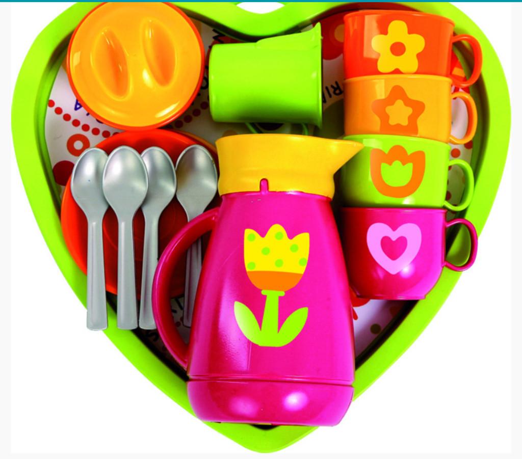 Dieses bunte Kaffeeservice Set begeistert mit seinem herzigen Design und eignet sich perfekt für die Kinderküche. Es enthält Geschirr für vier Personen, darunter Tassen, Untertassen, eine Teekanne, ein Milchkännchen, eine Zuckerdose sowie Löffelchen. Das Set wird auf einem praktischen herzförmigen Tablett geliefert und sorgt im Spiel für viel Freude.