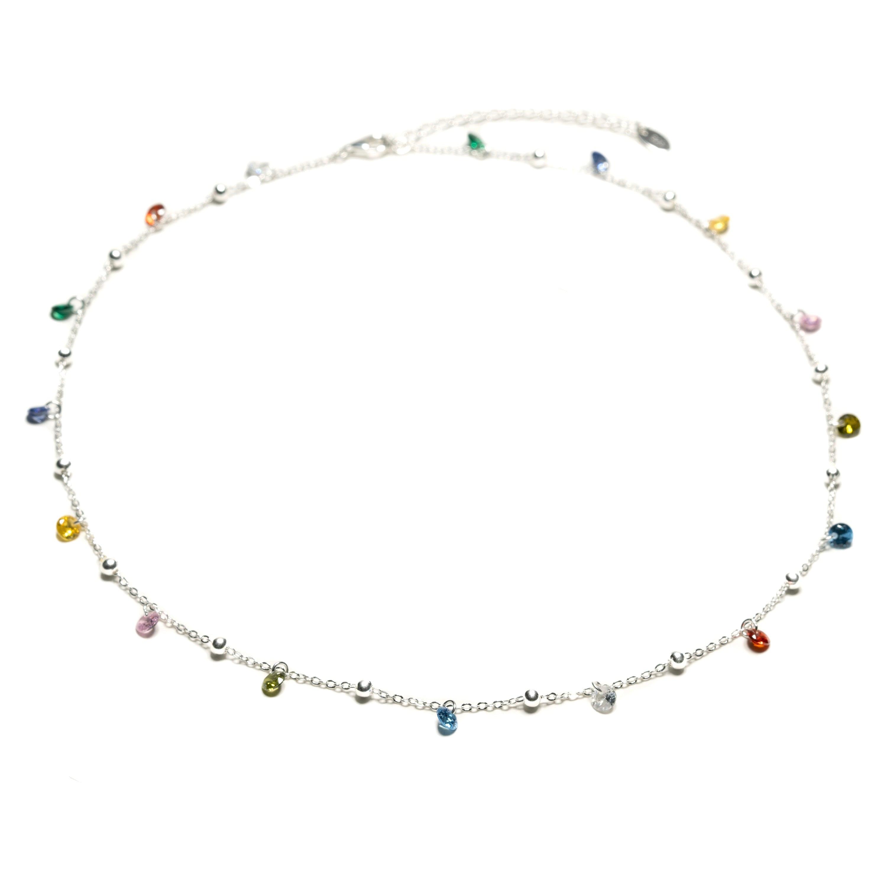 Diese filigrane Halskette wurde mit viel Liebe zum Detail von Hand gefertigt aus reinem 925er Sterling Silber. Die sorgfältig eingefassten, verschiedenfarbigen Zirkonia verleihen dem Schmuckstück einen fröhlichen und charmanten Glanz.