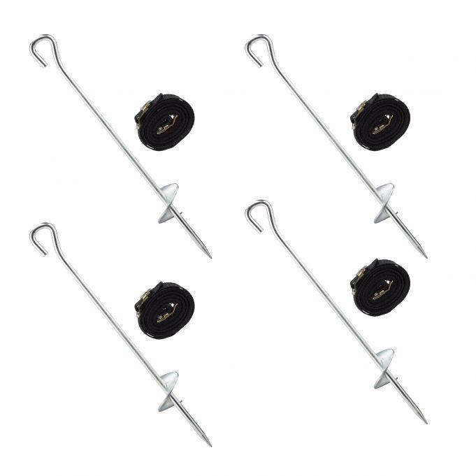 - Sichern Sie Trampoline und Outdoor-Geräte mit 4 robusten Bodenschrauben.
