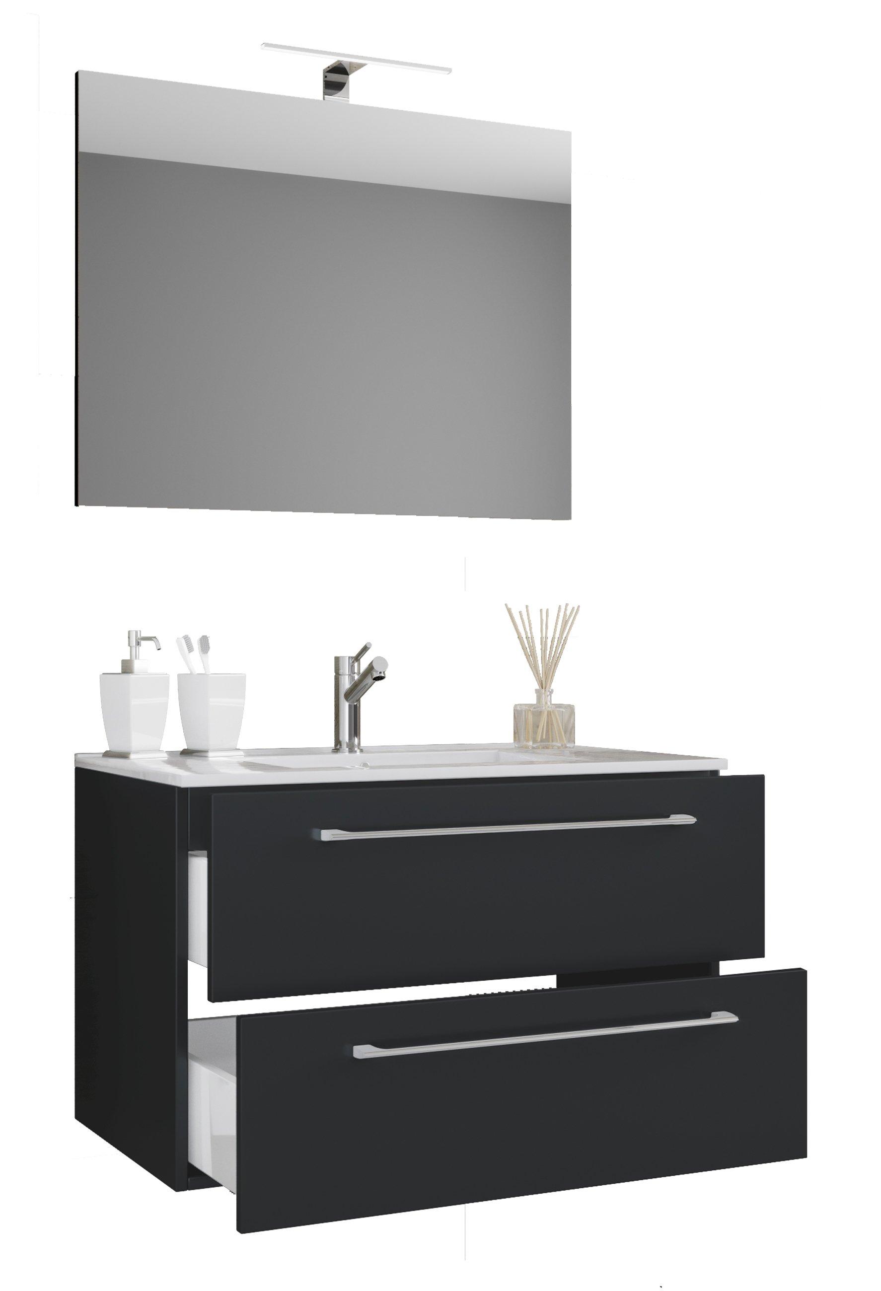 Das Badmöbel-Set besteht aus einem Unterschrank mit zwei Schubladen auf robusten Metallschienen.