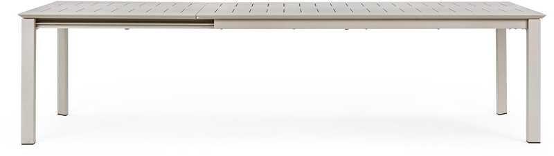 Gartentisch aus Aluminium, mit Pulverbeschichtung (Polyester). Ausziehbar mit Teleskopauszug. 2 Beine mit Rollen. Schrauben aus Edelstahl.
