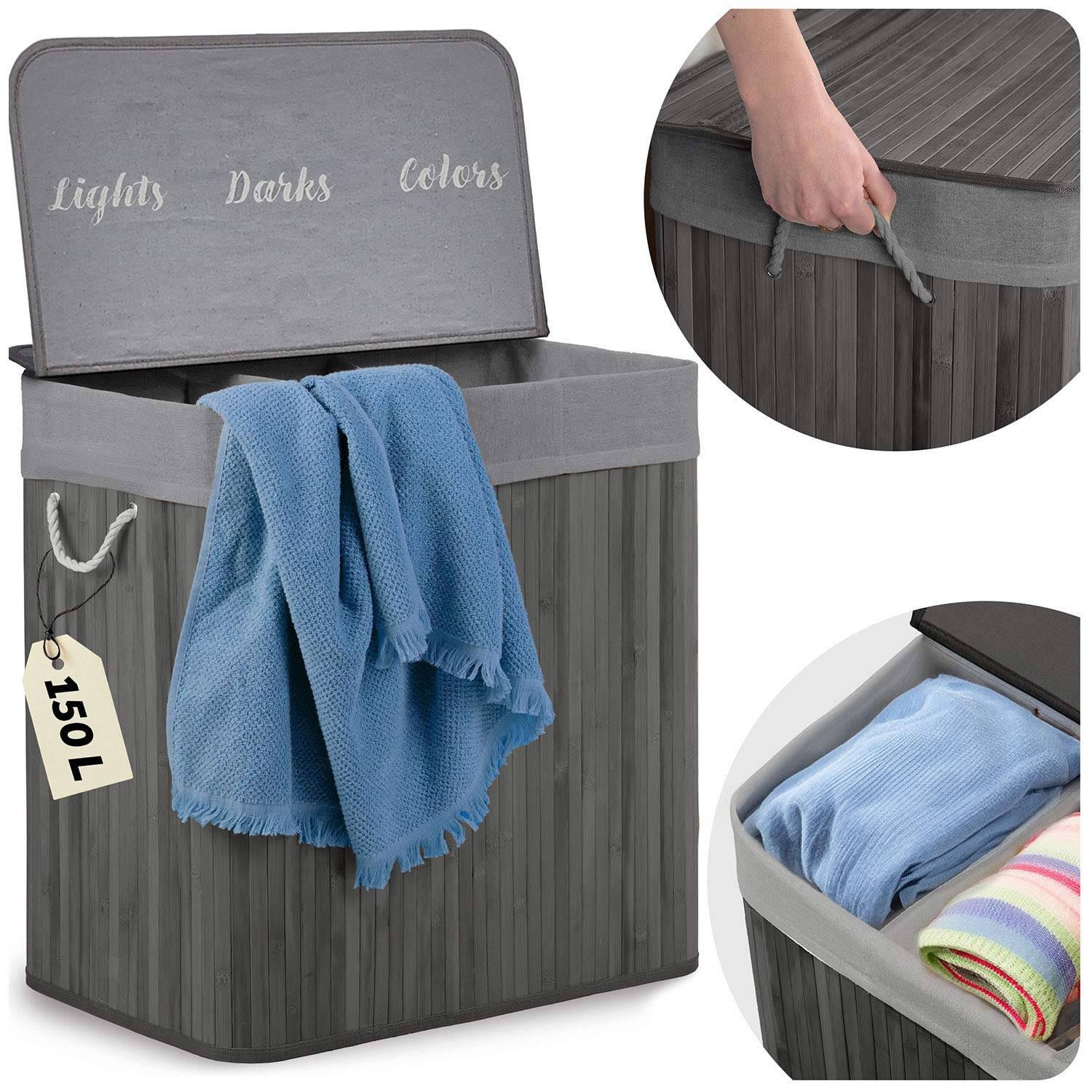Verwandeln Sie Ihre Wäscheroutine mit unserem Wäschekorb aus Bambus. Er bietet ein geräumiges Fassungsvermögen von 150 Litern und drei Fächer zum einfachen Sortieren. Dieser natürliche Bambuskorb verleiht Ihrem Zuhause nicht nur einen Hauch von Eleganz, sondern ist auch feuchtigkeitsbeständig und langlebig. Der herausnehmbare Baumwolleinsatz macht das Umfüllen der Wäsche zum Kinderspiel und sorgt für Ordnung und Übersicht.