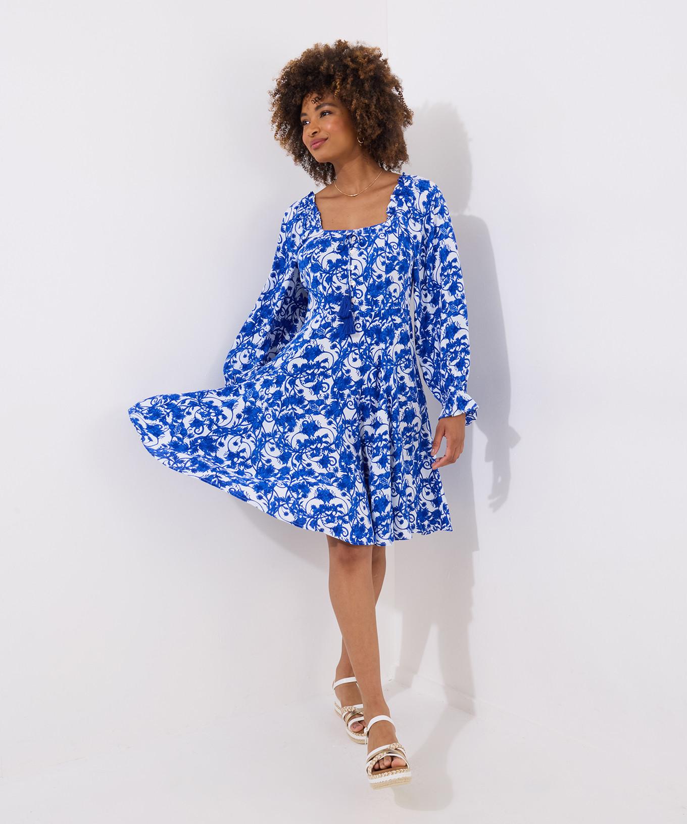 Dieses geblümte Minikleid ist vollgepackt mit Joe Browns' Lieblingsdetails und ist ein Muss für den Sommer. Das langärmelige Minikleid präsentiert sich mit einem lebhaften blau-weissen, griechisch inspirierten Muster, das einen frischen und stilvollen Look bietet. Der eckige Ausschnitt wird durch ein Bindedetail mit Quasten ergänzt, das dem Design eine verspielte Note verleiht. Die langen Ärmel sind mit elastischen Bündchen versehen, die einen subtilen Rüscheneffekt erzeugen.