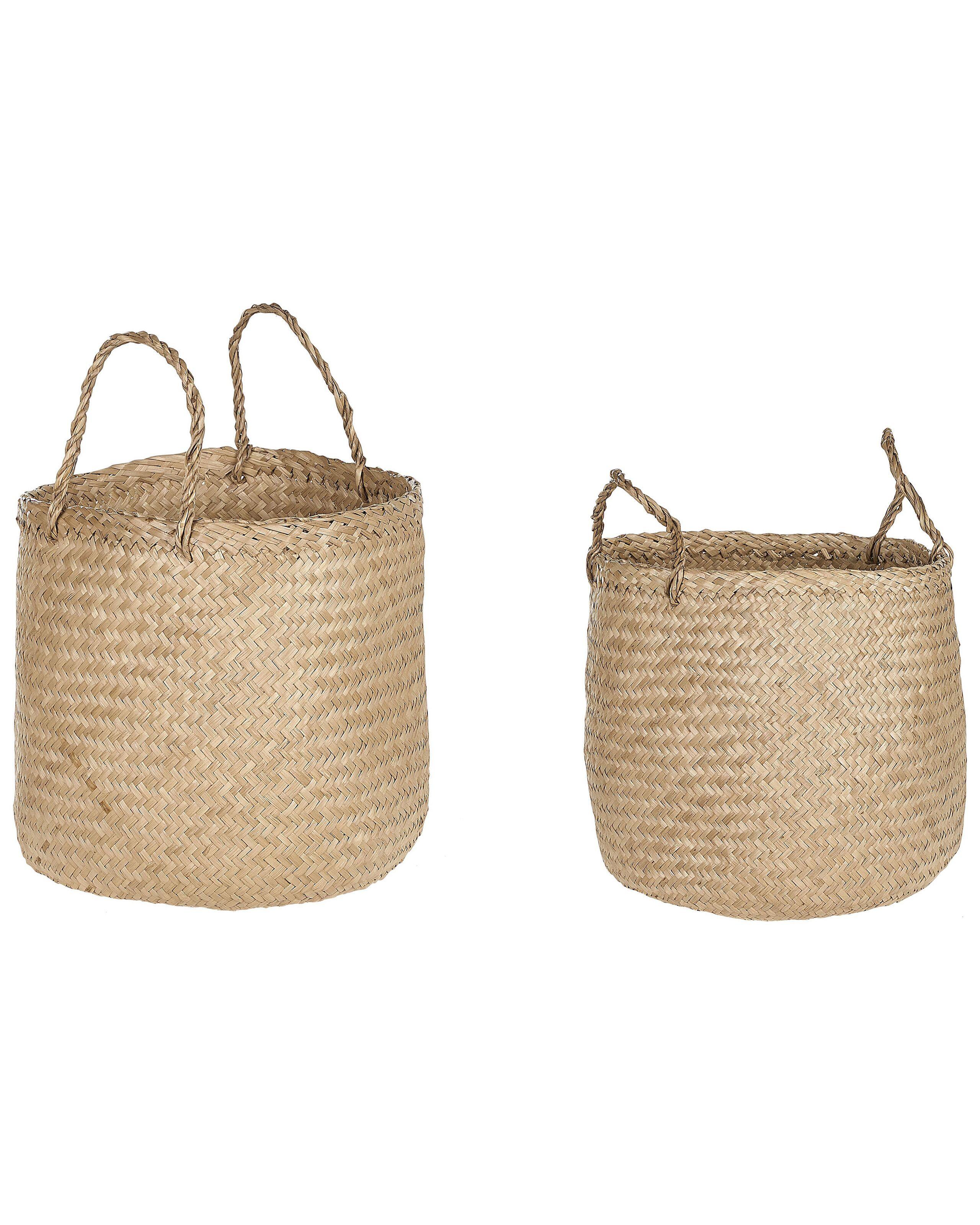 Set aus handgeflochtenen Körben. Ein Duo aus naturfarbenen Aufbewahrungskörben aus feinstem Seegras bringt Ordnung ins Haus. Die vielseitigen Schmuckstücke vereinen Funktionalität und Ästhetik und verleihen jedem Raum einen Hauch von Küstencharme. Mit den angebrachten Griffen lassen sich die wichtigsten Dinge mühelos verstauen, so dass das Aufräumen zum Kinderspiel wird.