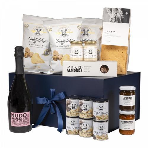 3x Trüffelchips 45g * Inhalt: 45g * Nährwerte pro 100g: 505 kcal * Zutaten: Kartoffeln, Sonnenblumenöl, Trüffel, Salz, Aroma * Herkunftsland: Italien * Allergikerinfo: Kann Spuren von Gluten haltigem Getreide, Milch und Milcherzeugnissen (Laktose) und Salz enthalten. 3x Trüffel Pistazien 60g * Inhalt: 60g * Nährwerte pro 100g: 600 kcal * Zutaten: Pistazien (97,4%), Sommertrüffel (Tuber Aevstivum Vitt. 1%), Salz (1%), Aroma. * Herkunftsland: Italien * Allergikerinfo: Kann Spuren der Gattung Tuber spp. und Salz enthalten. 2x Trüffel Erdnüsse 60g * Inhalt: 60g * Nährwerte pro 100g: 644 kcal * Zutaten: Erdnüsse, Sonnenblumenöl, Sommertrüffel, Salz, Aroma * Herkunftsland: Italien * Allergikerinfo: Enthält Erdnüsse und Salz. 2x Pecorinocreme mit schwarzem Trüffel 90g * Inhalt: 90g * Nährwerte pro 100g: 259 kcal * Zutaten: Sahne, Pecorino Romano, Milch, Butter, Stärkemehl, schwarzer Trüffel, Perigord Trüffel, Aroma, natürliche Aromen, Soja * Herkunftsland: Italien * Allergikerinfo: Enthält Soja, Milch und Milcherzeugnisse. 1x Tapenande aus schwarzen Oliven & Basilikum 140g * Inhalt: 140g * Nährwerte pro 100g: 288 kcal * Zutaten: Schwarze Oliven 77%, natives Olivenöl extra, sonnengetrocknete Tomaten 4%, Kapern, Knoblauch, Senf (Wasser, Senfkörner, Essig, Salz), Zitronensaft, Sardellenpaste (Sardellen (Fisch), Sonnenblumenöl, aromatisierter Weinessig, Salz), Salz, 0,8% Gewürze, davon Basilikum-Antioxidans Rosmarin-Extrakt. * Herkunftsland: Dänemark * Allergikerinfo: Kann Spuren von Salz enthalten 1x Linguine Chilli * Inhalt: 150g * Nährwerte: 428kcal / 100g * Zutaten: Weizenmehl, natives Olivenöl extra, Bierhefe, Salz, Weizenmalzmehl, rotes Chili 0,5 % * Allergikerinfo: Kann spuren von Salz enthalten 1x Bruschetta-Knoblauch 150g * Inhalt: 150g * Nährwerte pro 100g: 393 kcal * Zutaten: Weizenmehl, Sonnenblumenöl, Salz, Gerstenmalz, Hefe, Knoblauch 0,5 % * Herkunftsland: Dänemark * Allergikerinfo: Enthält Weizen, Gerstenmalz, kann Spuren von Salz enthalten. 1x Geräucherte Mandeln geröstet & gesalzen 100g * Inhalt: 100g * Nährwerte pro 100g: 604 kcal * Zutaten: Mandeln 93 %, Rapsöl, Sonnenblumenöl, Hickory-Rauchgewürz (Meersalz, Maismaltodextrin, Torulahefe, Sonnenblumenöl, Zuckerpulver, autolysierter Hefeextrakt, Melasse aus Zuckerrohr, natürliches Raucharoma (inkl. Hickory)), Karamell Farbe E150. * Herkunftsland: Dänemark * Allergikerinfo: Kann spuren von Meersalz enthalten 1x Prosecco Extra Dry "Nudo" DOC * Weintyp: Schaumwein * Alkoholgehalt in Vol%: 11 * Herkunft: Italien, Veneto * Rebsorten: 100% Glera * Geschmack: trocken * Aroma: grünem Apfel, Steinobst, Mango und florale Nuancen * Optimale Serviertemperatur in °C: 6 - 8 * Flaschengrösse in l: 0,75 * Verschlusstyp: Korken * Allergene und Inhaltsstoffe: enthält Sulfite Gemäss Jugendschutz: * Darf kein Alkohol an Kinder und Jugendliche unter 16 Jahren verkauft oder ausgeschenkt werden, * Dürfen Bier und Wein nur an über 16-Jährige verkauft oder ausgeschenkt werden, * Dürfen Spirituosen, Aperitifs und Alcopops nur an über 18-Jährige verkauft oder ausgeschenkt werden. Hinweis: Der Geschenkkorb kann leicht variieren, abhängig von der saisonalen Verfügbarkeit.