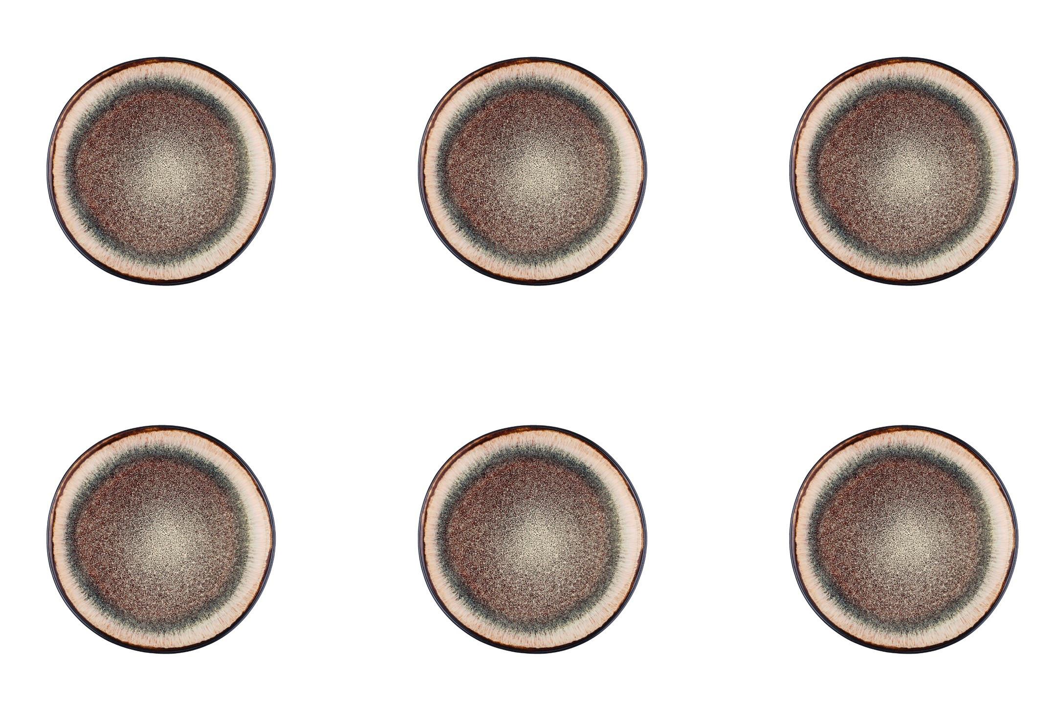 Die IRIS-Kollektion ist eine subtile Mischung aus Schlichtheit und Originalität. Die schwarze Farbe an der Aussenseite verleiht Deinem Tisch einen eleganten und raffinierten Touch, während die reaktive Glasur im Inneren ein tiefes und einzigartiges Relief verleiht. In der Variante Wild Brown zeichnet sich eine pigmentierte Scheibe mit unendlich vielen Farben ab, die an unser optisches System erinnert und Deinen Präparaten eine blendende organische Optik verleiht.- Enthält: 6 Teller Ø 16 cm