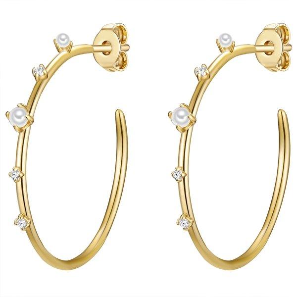 Creolen dürfen in keinem Schmuckkästchen fehlen und erst recht nicht diese außergewöhnlichen Exemplare des Labels Glanzstücke München: Die filigrane Creole ist im Wechsel verziert mit Zirkoniakristallen und winzigen Süßwasser-Zuchtperlen - ein zauberhafter Kontrast zwischen Edelmetall, dem Funkeln der Kristalle in Diamantschliff und dem zarten Schimmer der Perlen. Gefertigt aus hochwertigem 925er Sterlingsilber und mit warmem Gelbgold beschichtet, verleihen die Ohrstecker jedem Outfit einen Hauch Glamour und sind immer ein Eyecatcher. Der praktische Steckverschluss sorgt für hohen Tragekomfort und einfaches An- und Ablegen.