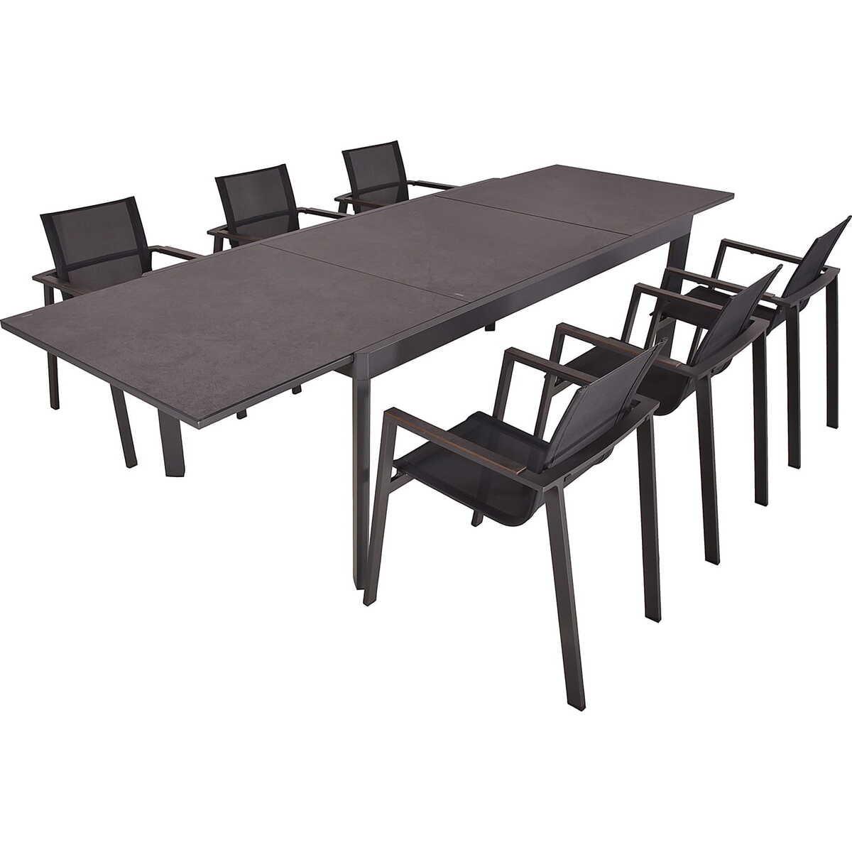 Vielseitiges Set für Innen- und Aussenbereiche Ausziehtisch von 2m auf 3m verstellbar Sophia-Stühle im pfefferschwarzen Industrial-Design Robustes anthrazitfarbenes Aluminiumgestell Tischplatte aus elegantem Keramikoptik-Glas Wetterfest und langlebig Einfache Handhabung und stapelbare Stühle Perfekt für Mahlzeiten im Freien und gesellige Zusammenkünfte