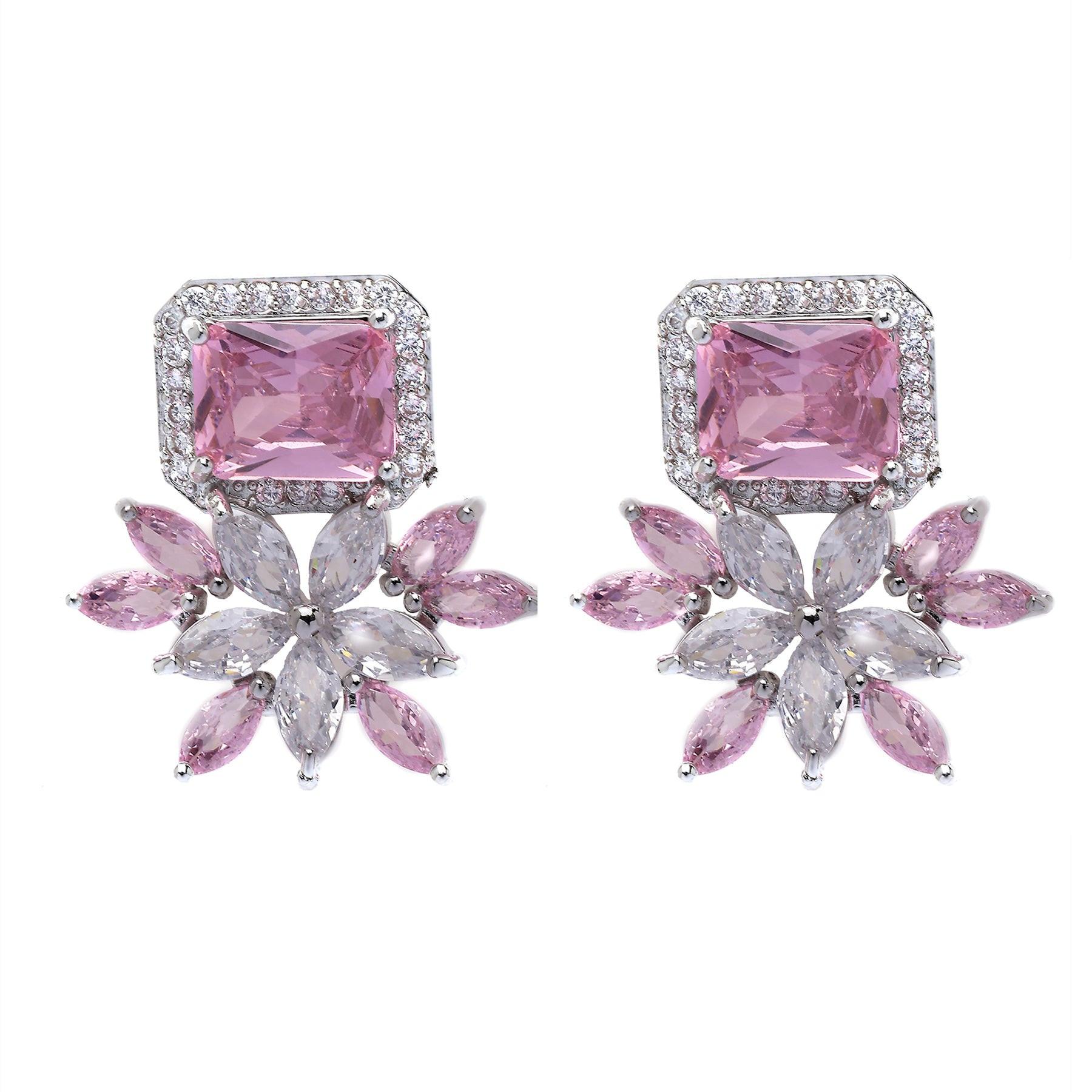 Eine faszinierende Kombination aus geometrischen und floralen Elementen. Ein großer, quadratisch geschliffener rosa Edelstein, umgeben von einem Kristallkranz, thront auf einem zarten, blütenförmigen Cluster aus rosa und weißen Steinen. Die kontrastierenden Formen und Farben ergeben ein ausdrucksstarkes und auffälliges Design. Größe: 2,4 cm x 2,5 cm | Beschichtung: Rhodiumplattiert | Verschluss: Stecker und Rückseite