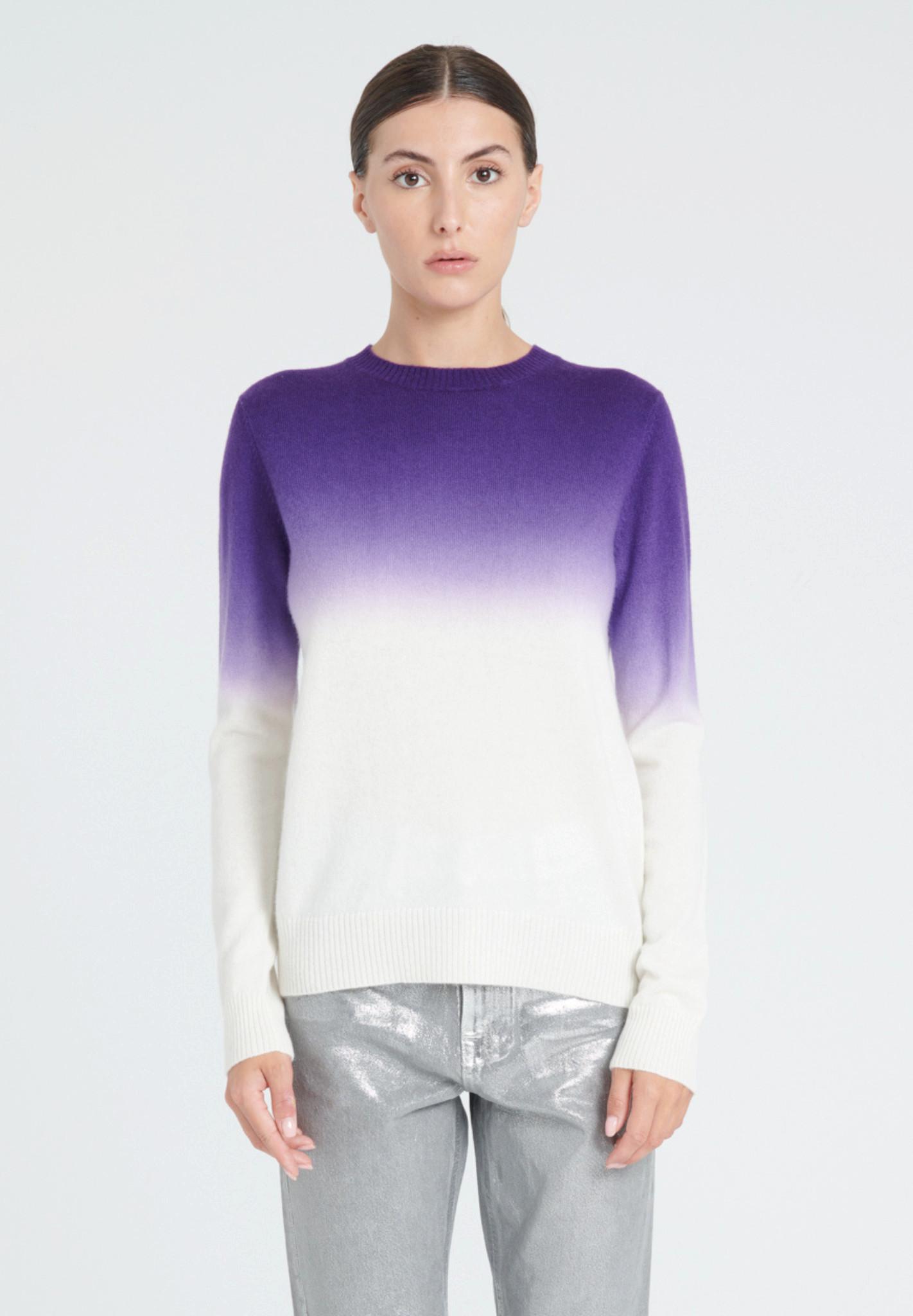 Dieser Pullover ist aus weichem, feinem Kaschmir gefertigt und weist an den Bündchen und am Saum ein abstraktes Tie-Dye-Muster auf. Er hat einen leicht taillierten Schnitt, der durch gerippte Kanten betont wird. Er kann teilweise in Jeans gesteckt oder mit Jogginghosen kombiniert werden.