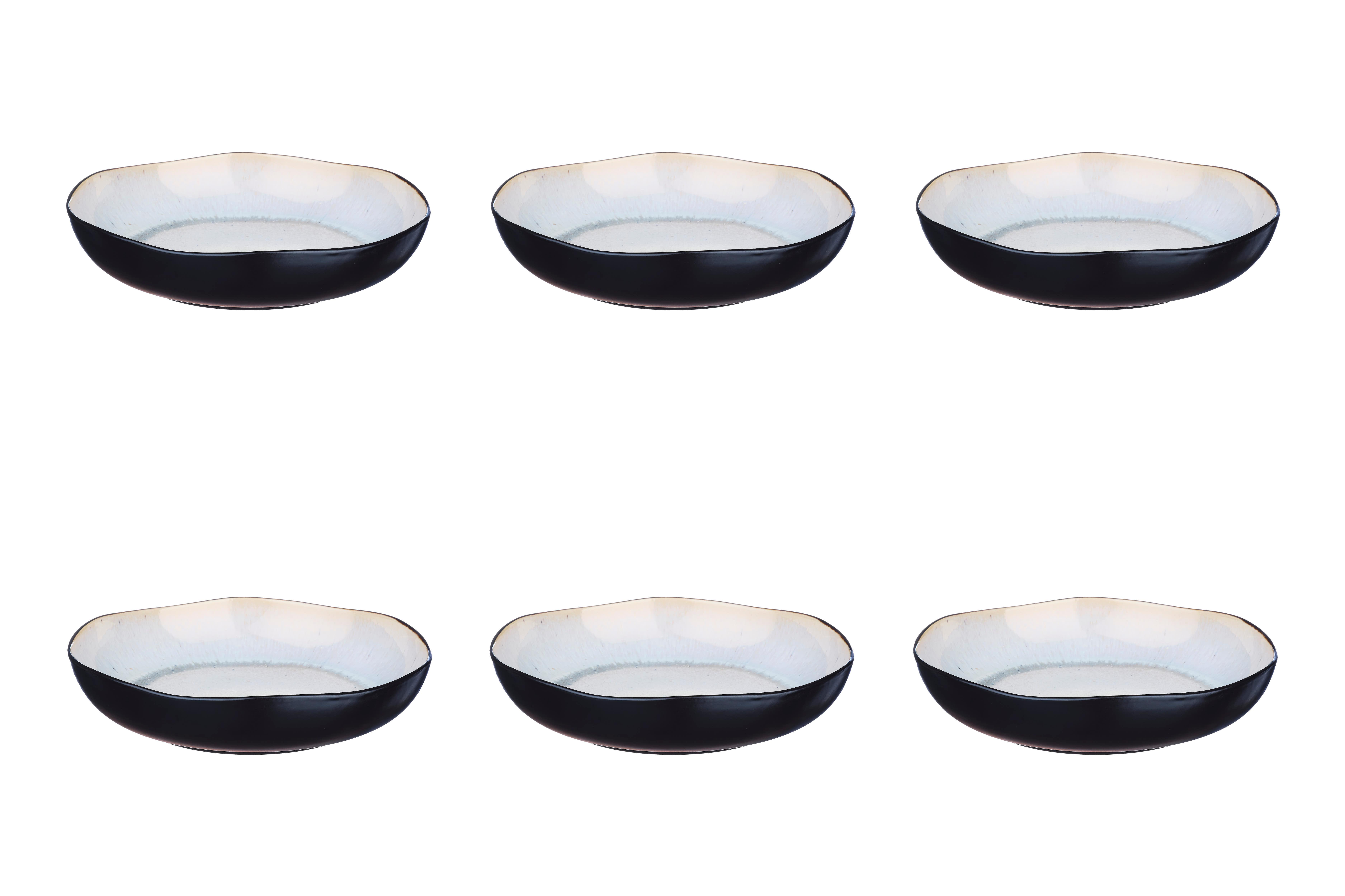Dieser Suppenteller ist eine grosse Schüssel mit einer Höhe von 5 cm. Seine asymmetrische Form und grosse Kapazität machen ihn perfekt zum Servieren von Gerichten in Sosse, Suppen oder internationaler Küche und bieten eine visuelle Attraktivität, die sowohl Ihren Geschmacksknospen als auch Ihren Gästen gefällt. Was die Herstellung betrifft, so werden nach einem ersten Brand des Tons bei niedriger Temperatur reaktive Glasuren in verschiedenen Farben auf das Steingut aufgetragen, wodurch es ein einzigartiges Relief und einen perlmuttartigen Effekt erhält. Das Auftreten von Farbnuancen von einem Stück zum anderen ist das Ergebnis einer geschickten Mischung aus Brenntechniken und der Art und Weise, wie die Glasur aufgetragen wird. Die IRIS-Kollektion ist eine subtile Mischung aus Schlichtheit und Originalität. Ihre schwarze Aussenseite bringt einen eleganten und raffinierten Touch auf Ihren Tisch, während die reaktiven Glasuren auf der Innenseite ihr ein tiefes und einzigartiges Relief verleihen. In der WHITE IVORY-Variante entsteht ein grau-weisser gesprenkelter Farbverlauf, der diese Kollektion zur Quintessenz des alltäglichen Geschirrs macht.