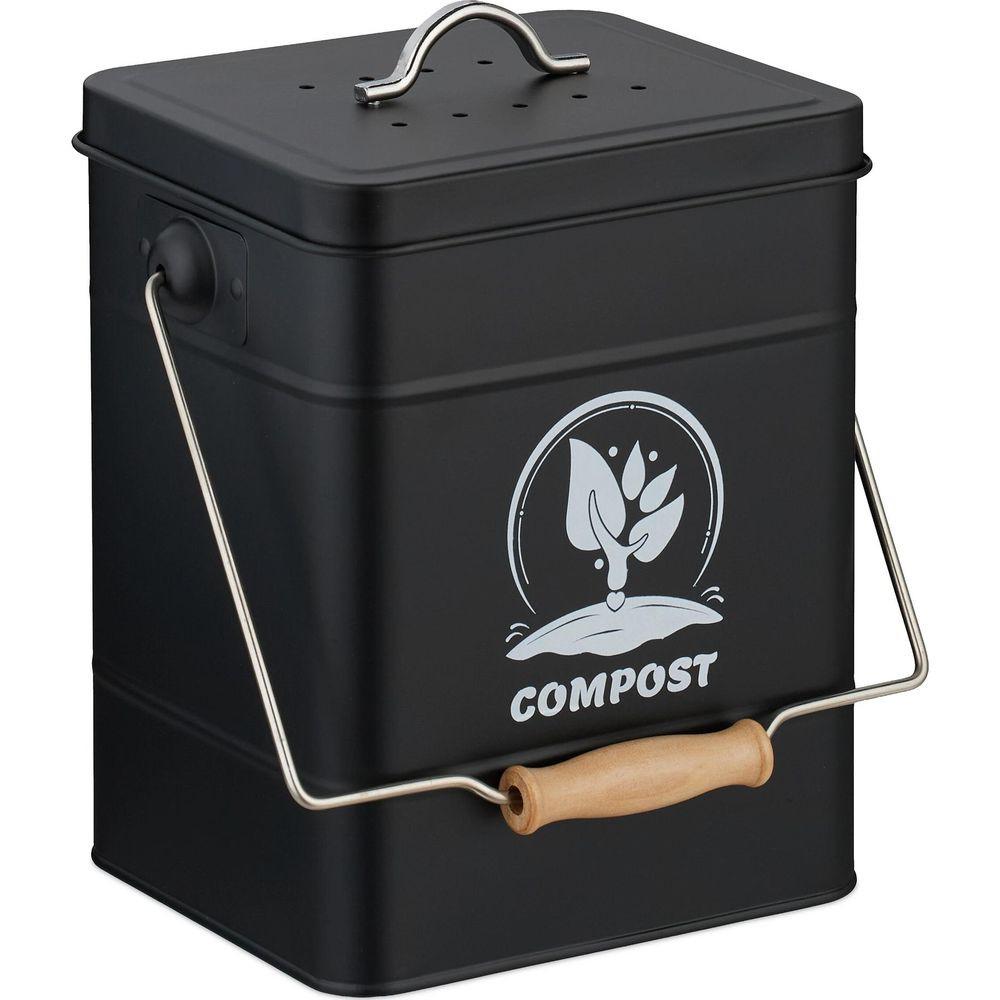 Fassungsvermögen: 6 l, Höhe: 25 cm, Anzahl Behälter: 1, Detailfarbe: Silber, Schwarz, Form: Eckig, Material: Holz, EisenBiomülleimer zum Sammeln von Küchenabfällen – Für Speisereste, Eierschalen etcMülleimer aus Metall mit Geruchsfilter – Leicht abwischbar und schützt vor GerüchenKomposteimer inklusive 2 Kohlefilter – Sofort nutzbar in Küche, auf Balkon, im WohnwagenLeichter Komposter im schicken Vintage-Look mit Aufdruck – Mit Griff am Deckel und HenkelKleiner Retro Abfalleimer aus Eisen – HBT: ca. 25 x 20,5 x 17.5 cmLieferumfang:1x Komposteimer in gewählter Farbe2x Aktivkohlefilter