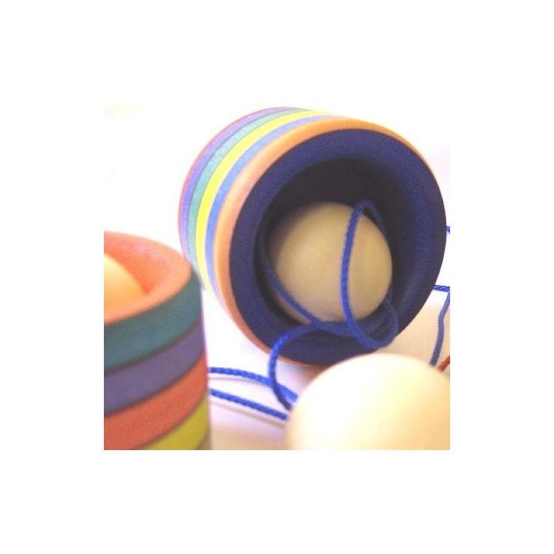Einfache Variante des klassischen Fangspieles "Bilboquet", im Streifendesign. Durchmesser 55 mm, Gestreift, Ahorn.