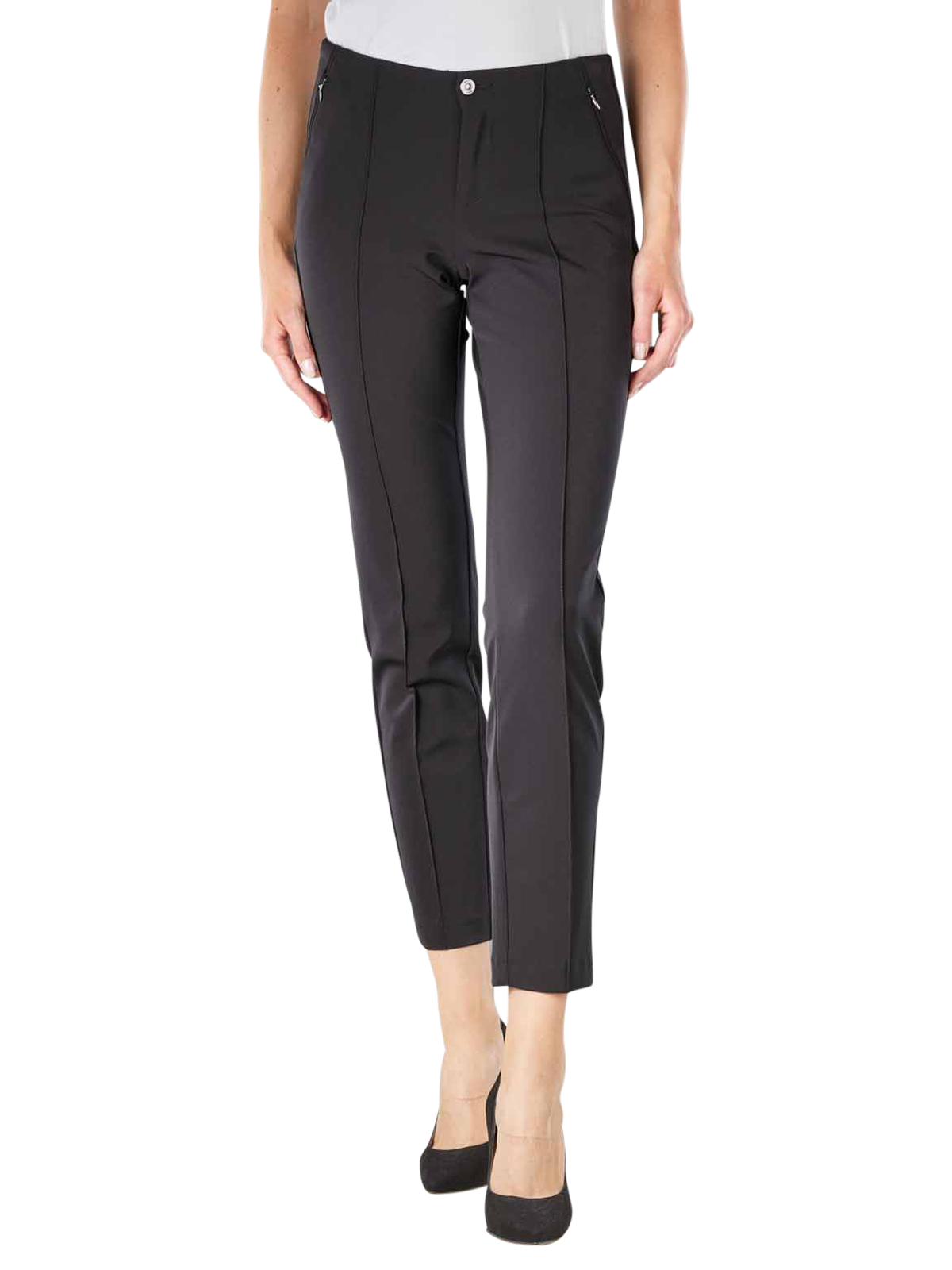 Die Anna Chino Hose hat eine schmale, zulaufende Passform und bietet eine moderne und schmeichelhafte Silhouette. Dieses klassische Modell ist aus einem dünnen, leicht glänzenden Stretch-Stoff gefertigt. Sie ist mit Reissverschluss und Knopf, verschliessbaren Seitentaschen, Paspel-Gesässtaschen und schicken Ziernähten im Bügelfalten-Look ausgestattet. Dieses wertvolle Modell hat eine mittlere Bundhöhe, gerade geschnittene Oberschenkel und enge, gerade Beinausschnitte.