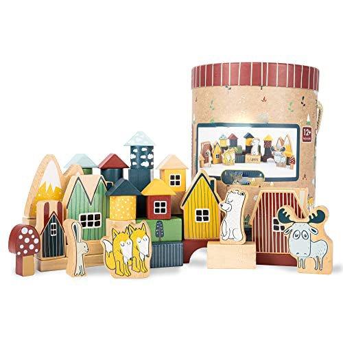 Ein komplettes Set, das Kinder lieben werden: Das 56-teilige Holzbaukasten-Set für Kinder ab 1 Jahr enthält Holzklötze, fünf Figuren, ihre Häuser und verschiedene Formen, ein Mini-Geschichtenbuch (englische Sprache nicht garantiert), eine Baumwolltasche und einen Schlüsselring Tolles Design: Eine Kombination von Holzbausteinen aus Wacholder- und Buchenholz mit abgerundeten Kanten in einer liebevoll gestalteten, stabilen Aufbewahrungsbox (17,5 x 22,5 cm) mit Kordelgriff für den einfachen Transport Spielerisch lernen: Spiel und Spaß mit den Figuren des Sortiments. Ganzheitliches Konzept, skandinavisches Design, hoher Lerneffekt, fördert Hand-Auge-Koordination, Motorik und Kreativität Für unsere Kleinsten: Geschlechtsneutrales Babyspielzeug aus hochwertigem, schadstofffreiem Holz, kindgerechte Formen und sorgfältig ausgewählte Farben auf Wasserbasis, daher absolut unbedenklich