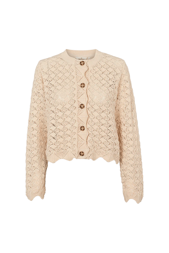 Der Dania Cardigan ist eine klassische und komfortable Weste für kältere Tage. Hergestellt aus 100% Bio-Baumwolle ist dieser Cardigan weich und warm, perfekt für Winterwetter. Der Cardigan-Stil verleiht ihm einen eleganten Look, während die beige Farbe ihm einen Hauch von Raffinesse verleiht. Die Weste ist mit einer Knopfleiste mit vier braunen Knöpfen ausgestattet, die einen Hauch von Detail bieten. Der Halsschutz, Rock und Ärmel sind alle gestrickt und bieten optimale Weichheit und Wärme.