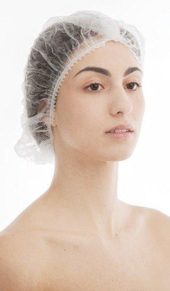 Handgearbeitete Einweg Haube aus Vliesstoff. Aufgrund der hohen Dehnbarkeit für alle Kopfgrössen (auch für Männer) geeignet.