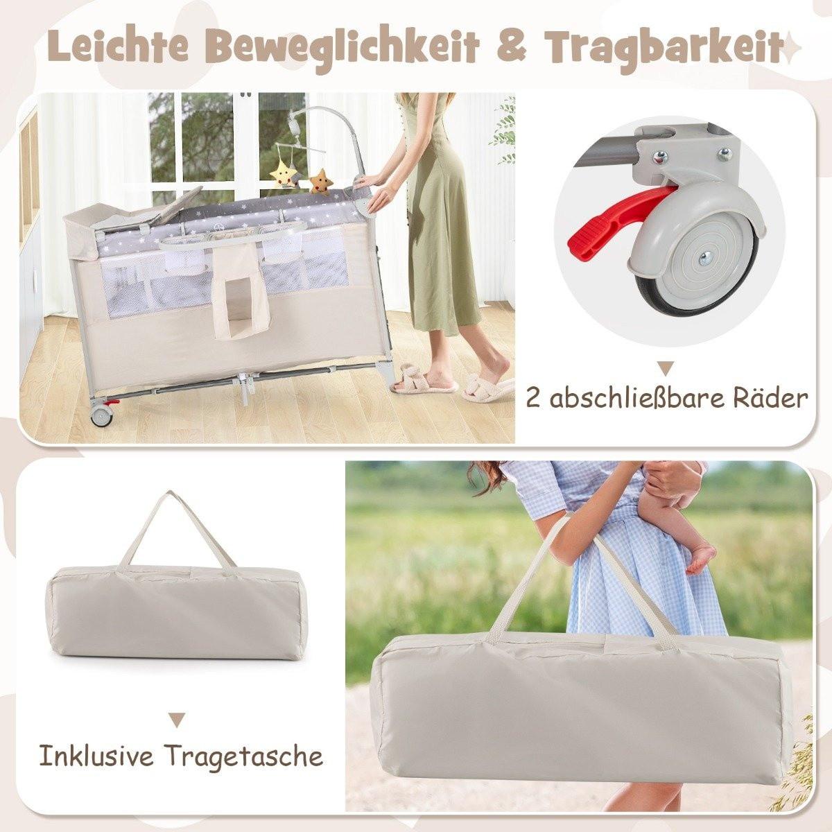 B2X 5 in 1 Beistellbett klappbar Reisebett mit Matratze 2 Ebene Babybett mit Rollen Beige