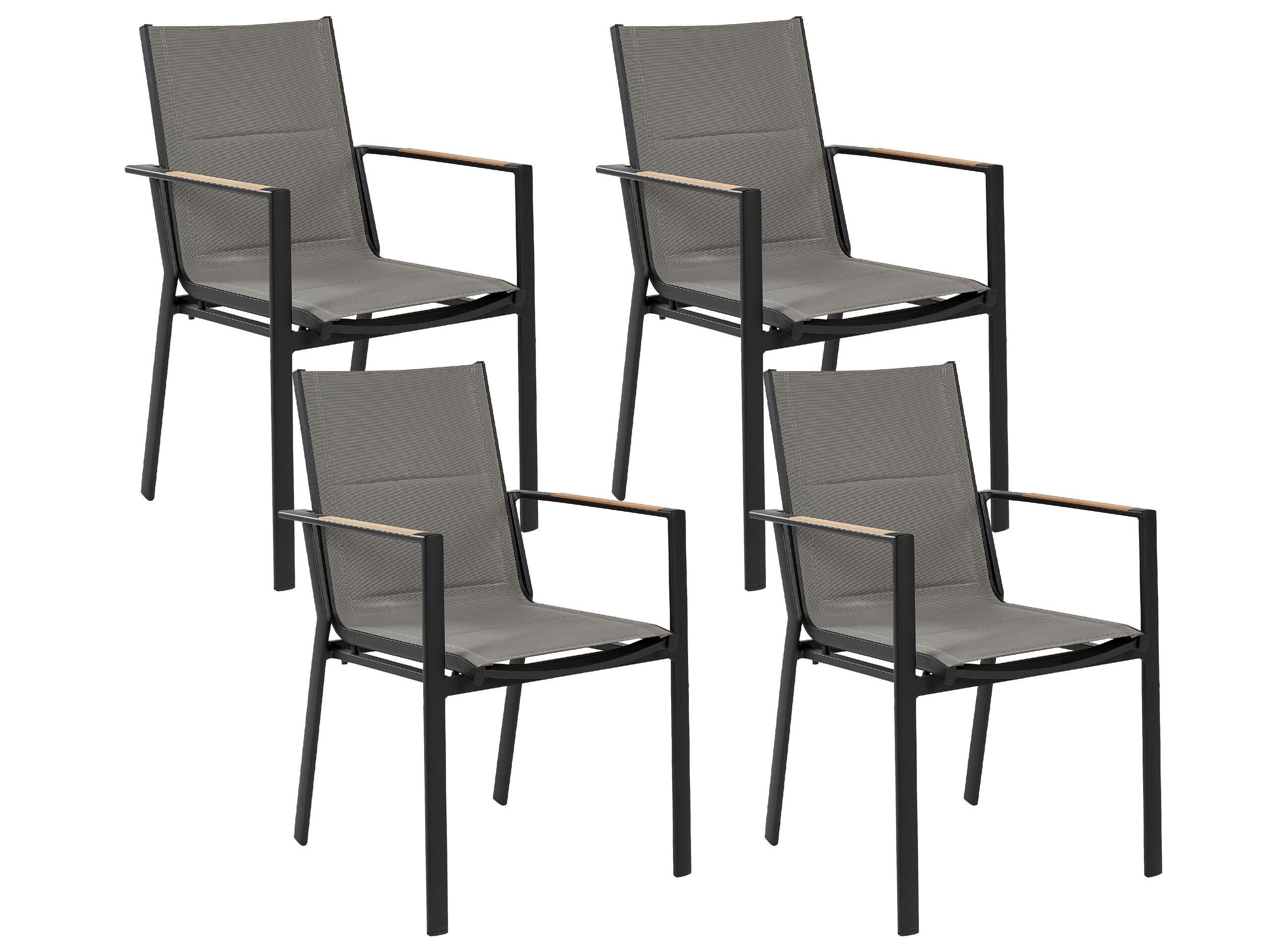 Moderne, schwarze Outdoor-Aluminiumstühle mit hochwertigen Stoffbezügen. Dieses Gartenstuhl-Set ist eine perfekte Sitzlösung sowohl für den Aussen- als auch den Innenbereich. Die ganze Sitzfläche der Stühle ist mit einem dicken, outdoortauglichen Stoff bespannt, der nicht nur sehr pflegeleicht ist, sondern auch einen hohen Sitzkomfort garantiert. Das moderne Kunststoffgewebe ist feuchtigkeitsresistent, schnelltrocknend und dank hoher Luftdurchlässigkeit äusserst hautsympathisch. Darüber hinaus sind die Stühle aus hochwertigen Materialien hergestellt, wodurch sie eine robuste Konstruktion haben und im Freien verwendet werden können. Die Alu-Stühle sind platzsparend verstaubar und wegen ihres leichten Gewichts auch einfach transportierbar.