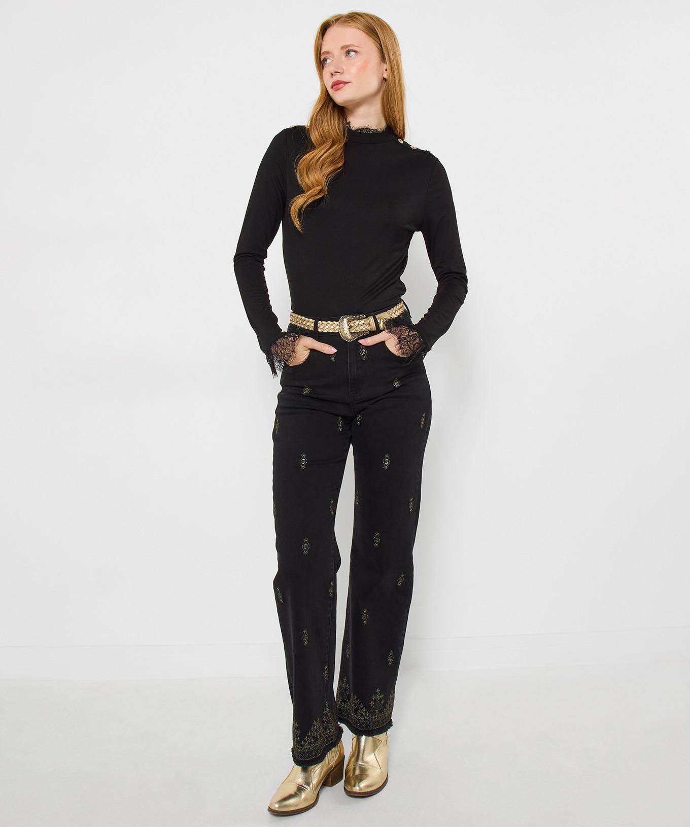 Dieses Jersey-Top verfügt über einen hohen Kragen und zarte Spitzenbesätze, die einen raffinierten und stilvollen Look bieten. Die langen Ärmel sind ebenfalls mit Spitze an den Manschetten verziert, was dem Design eine elegante Note verleiht. Das Top ist vielseitig für verschiedene Anlässe, von Freizeitausflügen bis hin zu eleganteren Veranstaltungen.
